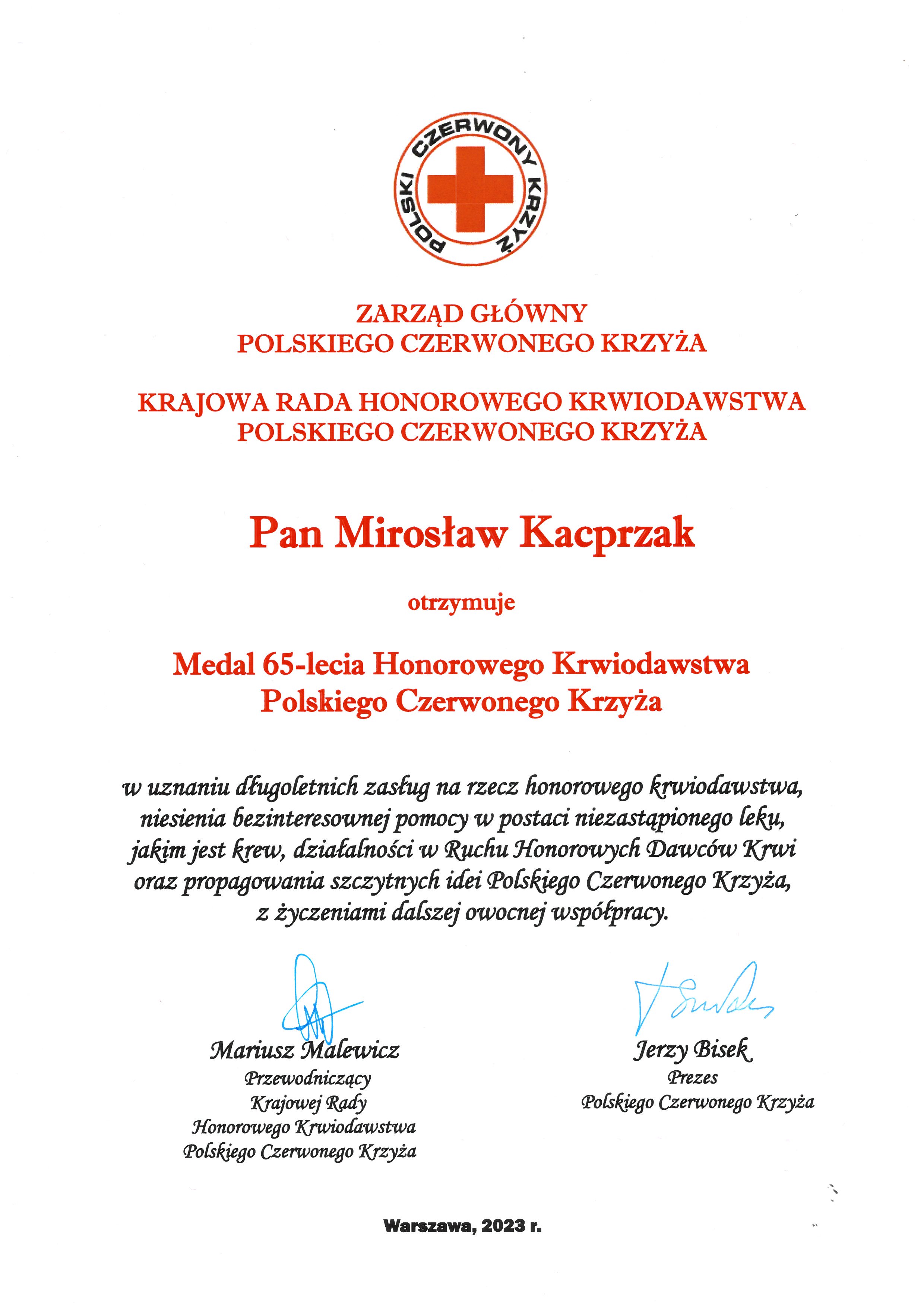 24 listopada 2023 r., podczas uroczystości zorganizowanych w Państwowej Szkole Muzycznej I i II stopnia, z-ca dowódcy JRG Stargard st. kpt. Mirosław Kacprzak otrzymał medal 65-lecia Honorowego Krwiodawstwa Polskiego Czerwonego Krzyża. Medal został przyznany w uznaniu długoletnich zasług na rzecz honorowego krwiodawstwa, niesienia bezinteresownej pomocy w postaci niezastąpionego leku, jakim jest krew, działalności w Ruchu Honorowych Dawców Krwi oraz propagowania szczytnych idei Polskiego Czerwonego Krzyża.