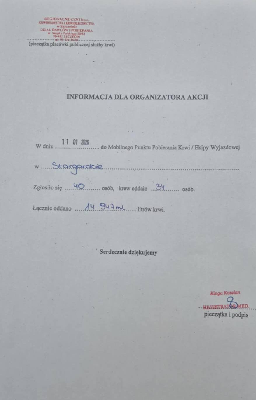 11 stycznia 2026 r. w ambulansie przystosowanym do poboru krwi, który zaparkował przy Komendzie Powiatowej PSP w Stargardzie, zorganizowana została akcja poboru krwi pod szyldem „Oddaj krew dla seniora" z okazji zbliżającego sìę dnia Babci i Dziadka. Akcję koordynował Klub HDK PCK „Płomyk” działający przy Komendzie Powiatowej PSP w Stargardzie. Ogromne podziękowania dla wszystkich, którzy odpowiedzieli na nasz apel i podzielili się tym co najcenniejsze.