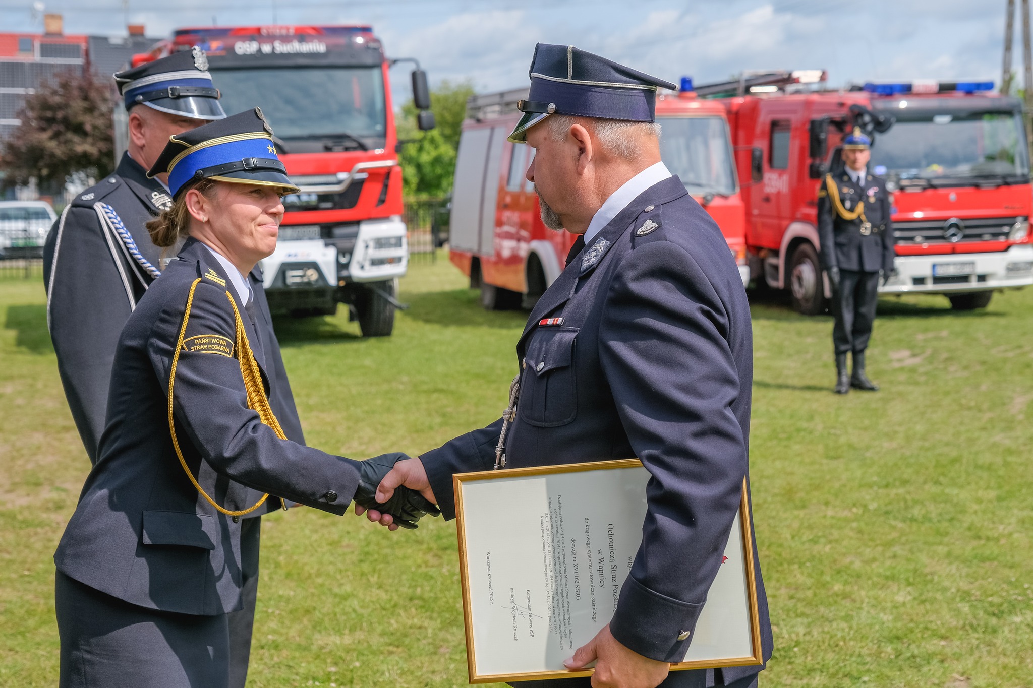 Następnie odbyło się wręczenie aktu włączenia Ochotniczej Straży Pożarnej w Wapnicy w struktury Krajowego Systemu Ratowniczo-Gaśniczego. Prezesowi OSP w Wappnicy, dh. Adamiowi Węgrzynowi, akt włączenia wręczyła Komendant Powiatowy Państwowej Straży Pożarnej w Stargardzie - bryg. Sylwia Formela w asyście Wiceprezesa ZOW ZOSP RP dh. Krzysztofa Kardasiewicza.