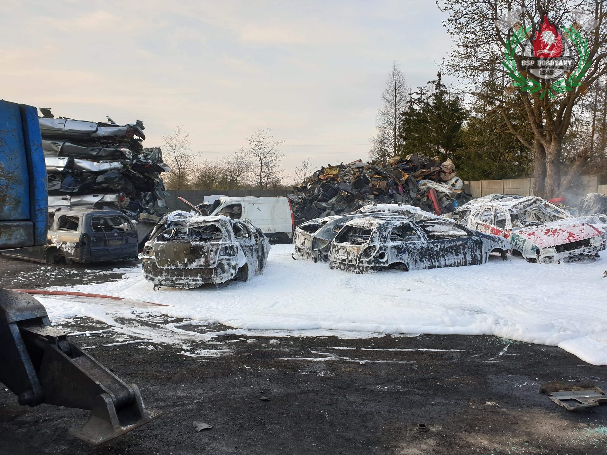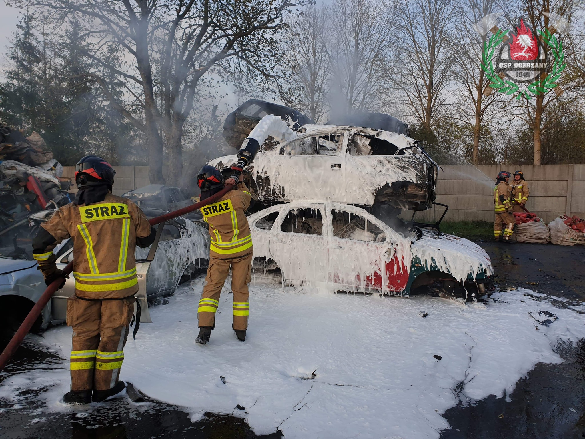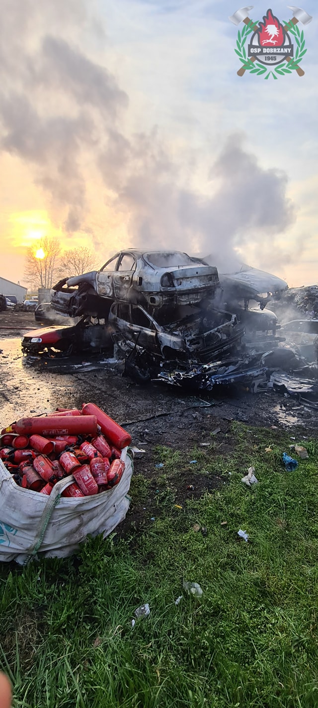28 kwietnia o godzinie 19:13 do Stanowiska Kierowania Komendanta Powiatowego w Stargardzie wpłynęła informacja o pożarze wraków na stacji demontażu w Dobrzanach. Na miejsce zadysponowano 5 zastępów Straży Pożarnej. Po przybyciu na miejsce zdarzenia stwierdzono pożar wraków samochodów osobowych na placu składowym na terenie stacji demontażu pojazdów. Pojazdy składowane były warstwowo jeden na drugim. Działania zastępów polegały na zabezpieczeniu miejsca zdarzenia i podaniu dwóch prądów wody w natarciu na pożar. Równolegle do prowadzonych działań pracownicy stacji przy pomocy ciężkiego sprzętu rozkładali pryzmę, co usprawniło akcję ratowniczo-gaśniczą. Po odseparowaniu pojazdów składowanych warstwami pokryto je pianą gaśniczą. Miejsce zdarzenia sprawdzono ponownie pod kątem występowania zarzewi ognia. Nie stwierdzono ich występowania. O godzinie 20:07 zastępy Straży Pożarnej zakończyły działania na miejscu zdarzenia i wróciły do jednostek. W działaniach brały udział zastępy Państwowej Straży Pożarnej w Stargardzie, oraz zastępy Ochotniczych Straży Pożarnych z Dobrzan, Marianowa oraz Długiego.