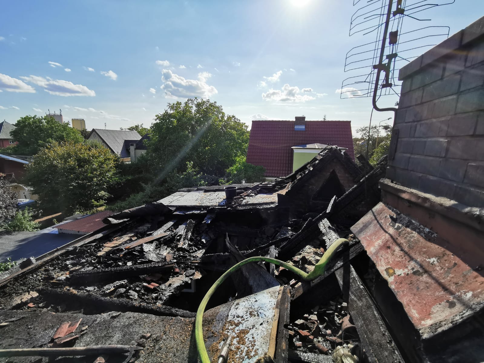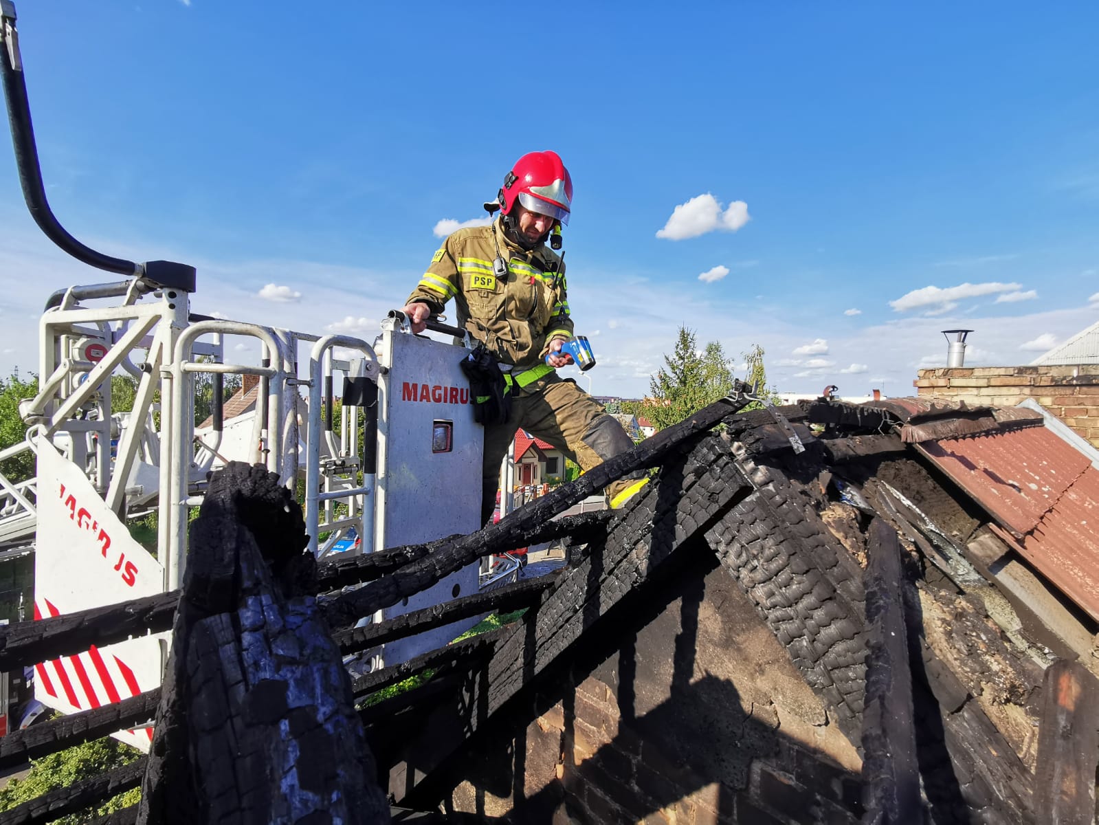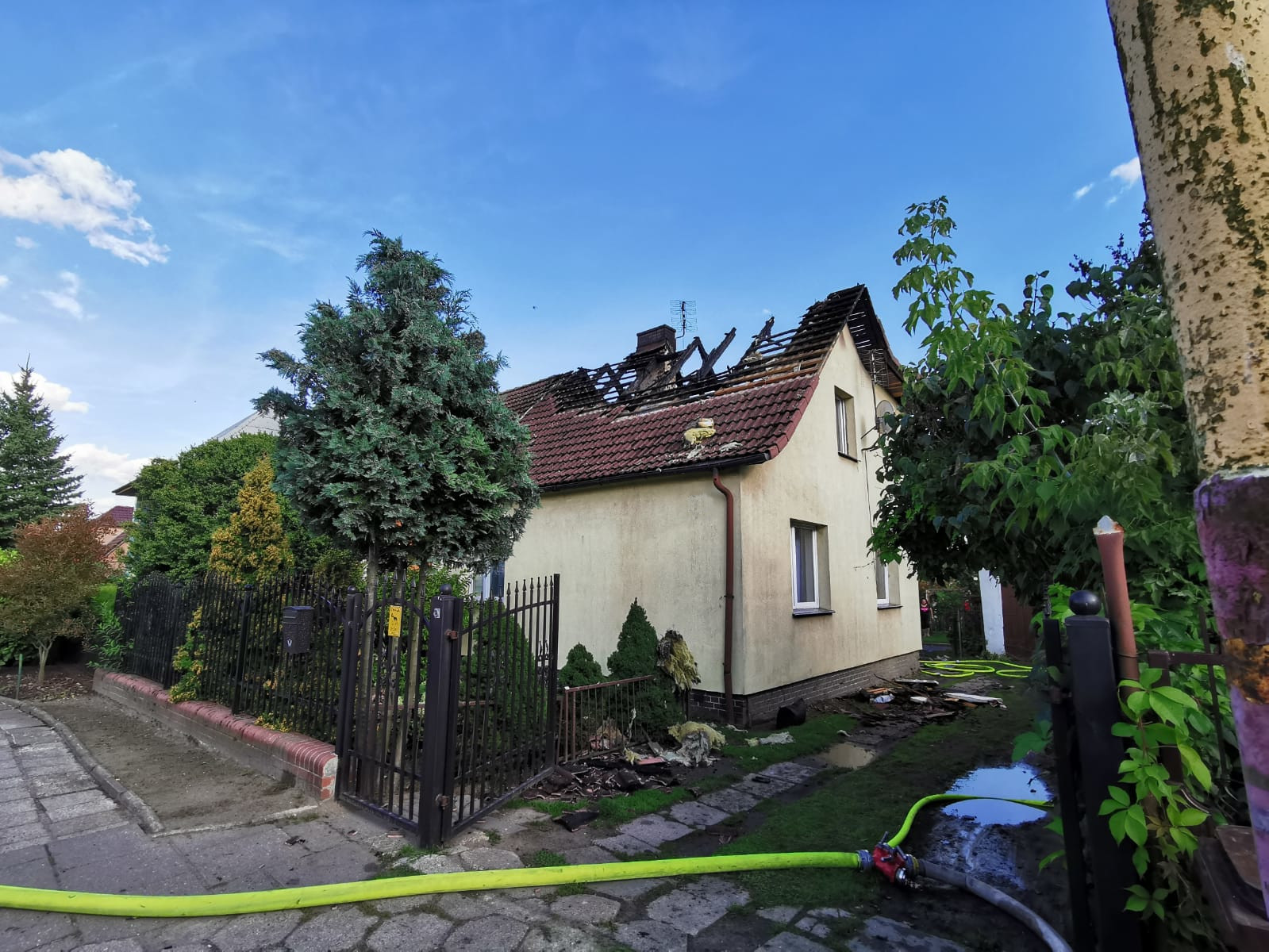 5 września 2021 r. o godzinie 14:23 do do Stanowiska Kierowania Komendanta Powiatowego w Stargardzie wpłyneła informacja, że na ul. Fryderyka Chopina pali się komin. Do zdarzenia zadysponowano trzy zastępy z JRG Stargard oraz jeden z OSP Żarowo. Po przyjeździe zastępów, zabezpieczono teren działań i stwierdzono, że pożarem objęte jest poddasze. Działania straży polegały na podaniu prądów wody w natarciu na palące się poddasze i jednego prądu wody w obronie na przyległy budynek mieszkalny. Rozstawiono rónież drabinę mechaniczną, z której podano kolejny prąd wody. w celu dokonania dostępu do poddasza przy pomocy bosaków zdjęto część dachówek i piłą piłą mechaniczną wykonano otwór. Z budynku wyniesiono butlę z gazem propan-butan znajdującą się na poddaszu. Podczas działań straży mieszkaniec domu objętego pożarem zaczął uskarżać się na problemy z oddychaniem i został zabrany przez ZRM do szpitala. Pomieszczenia przeszukano i sprawdzono pirometrem, nie stwierdzając niebezpiecznego nagrzania elementów. Działania straży pożarnej zostały zakończone o godzinie 17:08.