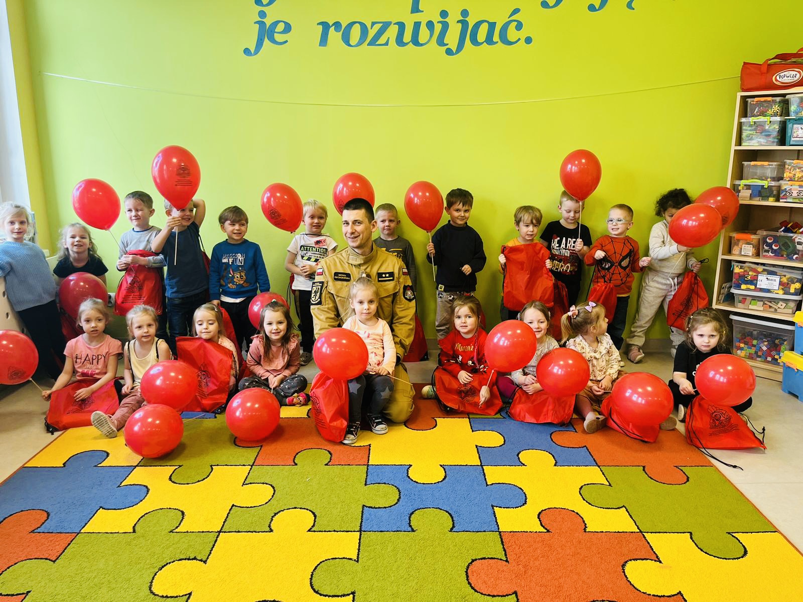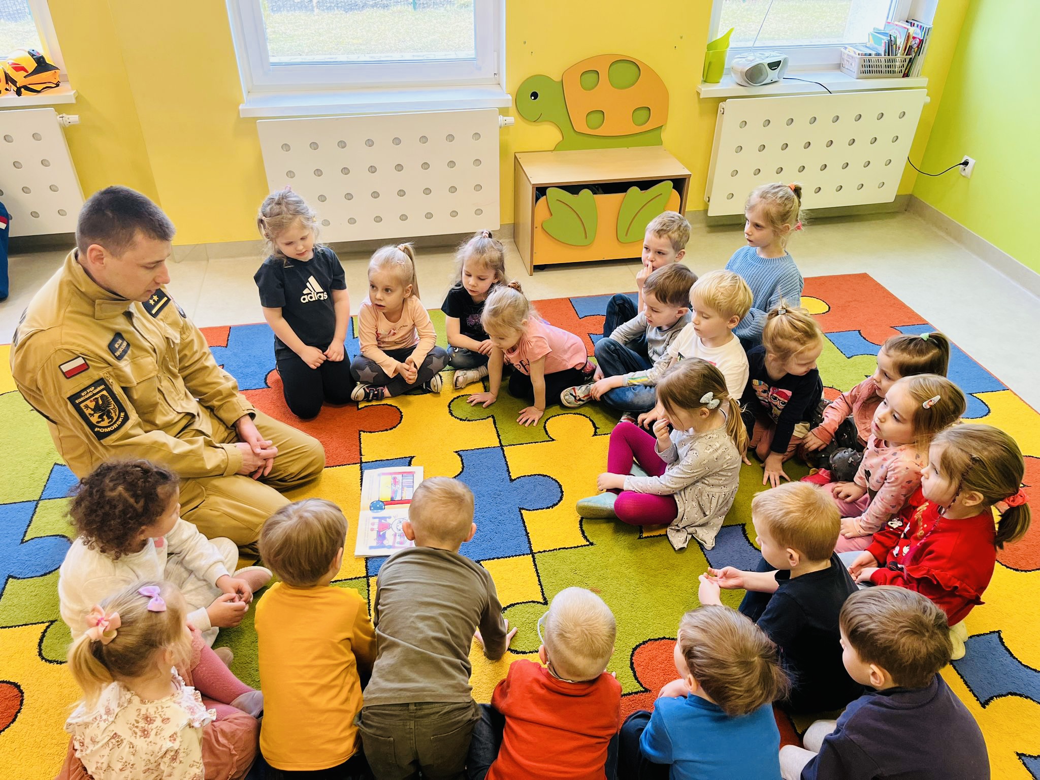 Michał przeczytał dzieciom bajkę o przygodach Kici Koci. Opowiedział o codziennej służbie strażaka. Przypomniał dzieciom numer alarmowy 112, a także przybliżył jak powinno wyglądać postępowanie w razie zauważenia pożaru. Omówił podstawy pierwszej pomocy. Szczególne zainteresowanie dzieci wzbudził strażacki ubiór! Przedszkolaki miały okazję przymierzyć hełm oraz strażacką kurtkę. Na zakończenie dzieci otrzymały upominki.