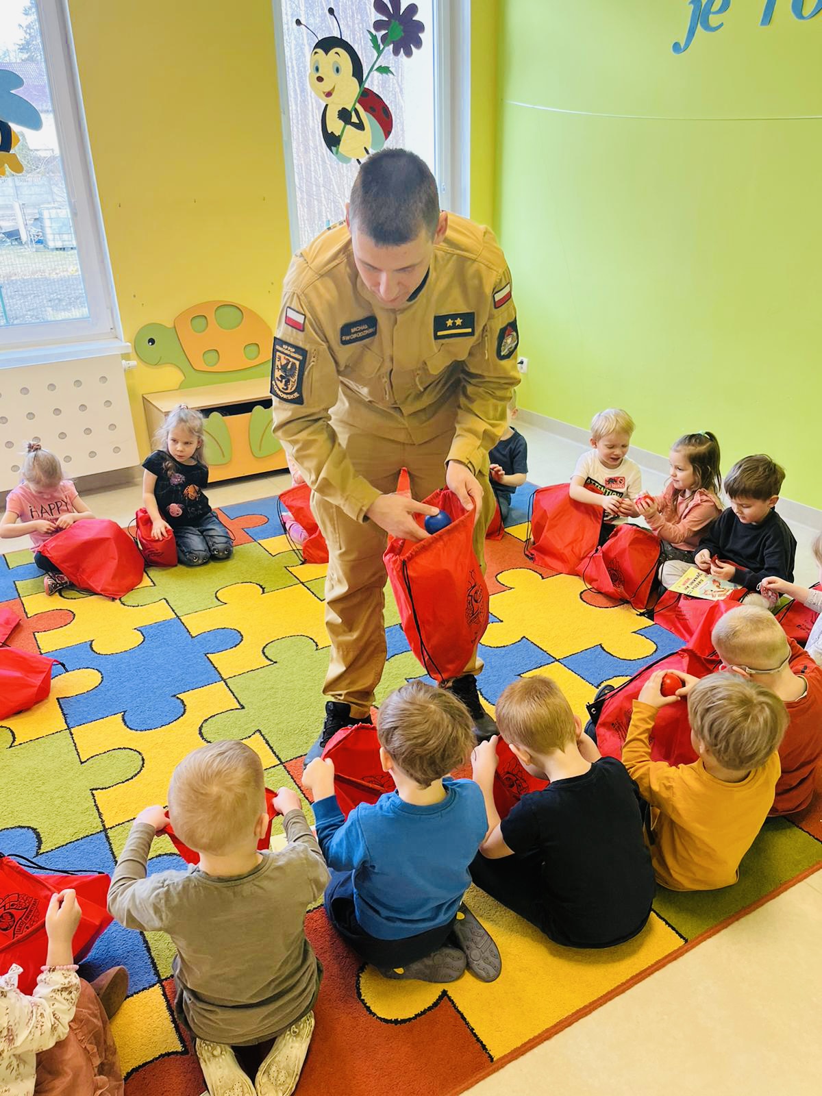 16 marca 2023 roku grupę Motylki z Przedszkola i Żłobka ANIOŁEK w Starogardzie Gdańskim odwiedził nasz kolega mł. kpt. Michał Swobodziński.