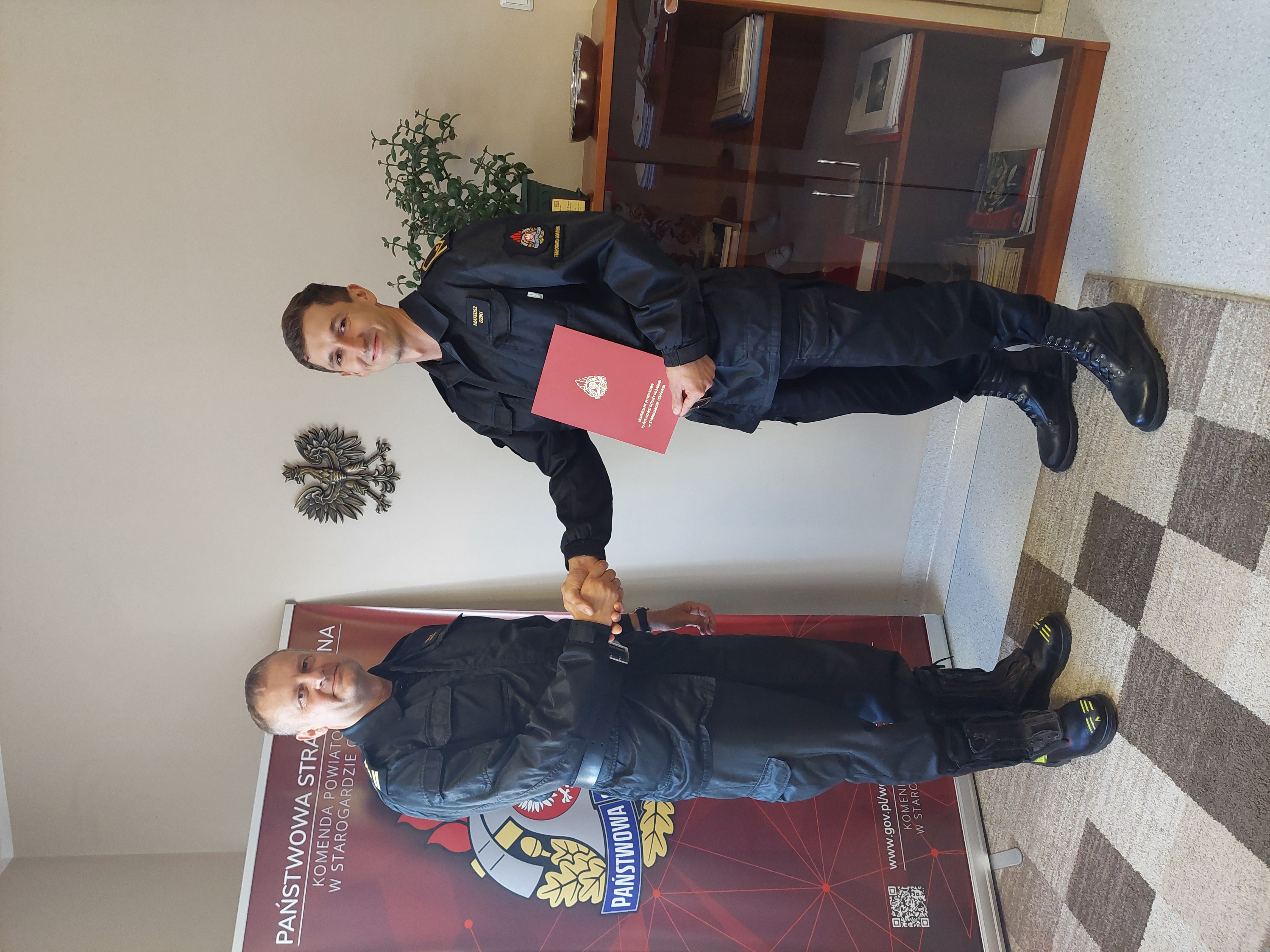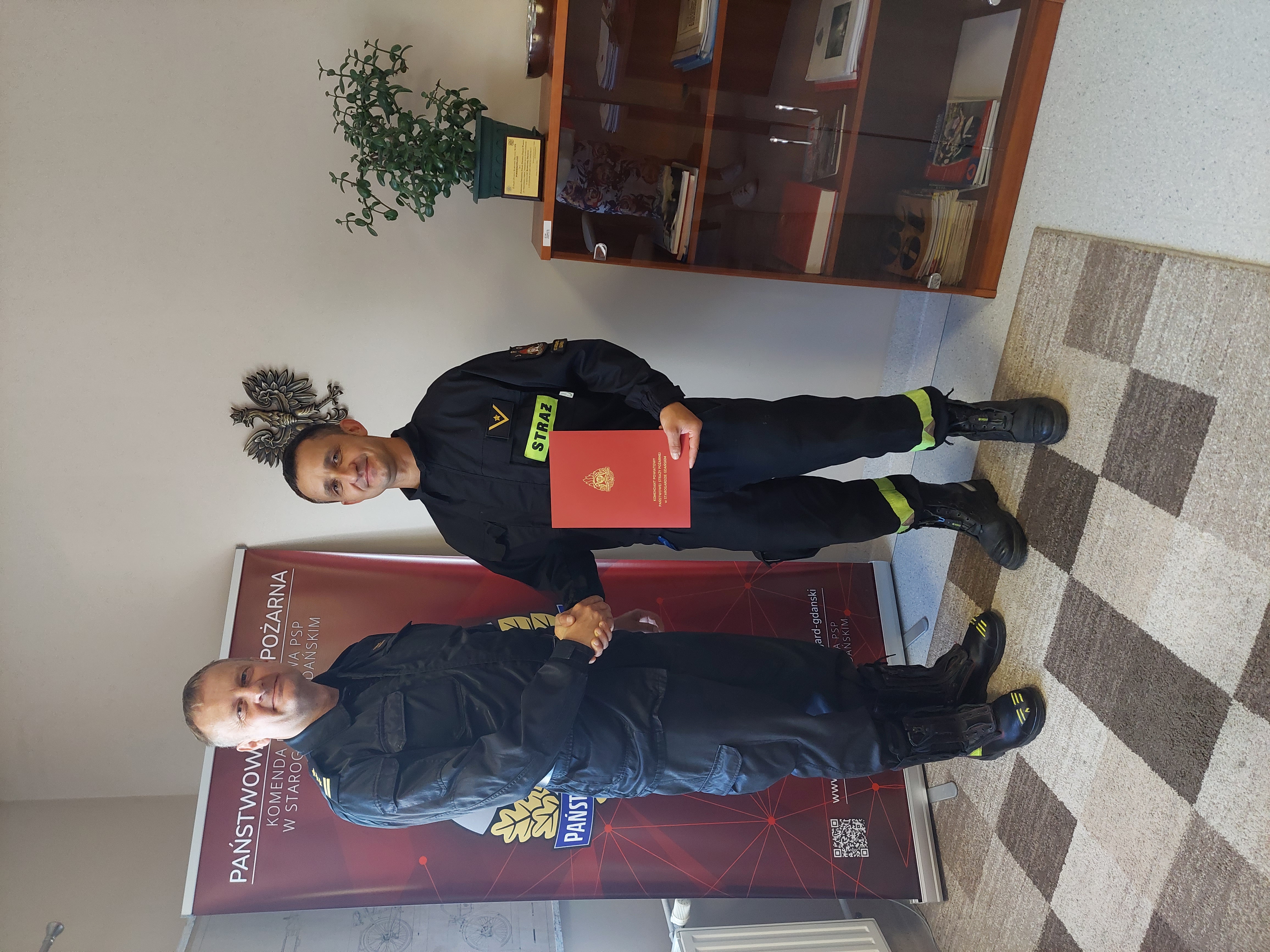 01 sierpnia 2022 r. Komendant Powiatowy PSP w Starogardzie Gdańskim st. bryg. Tomasz Wardyn wręczył funkcjonariuszom mł. asp. Mateuszowi Dziki oraz mł. asp. Grzegorzowi Mąkosie decyzje w sprawie przyznania nagród pieniężnych. Wyróżnieni funkcjonariusze otrzymali nagrody za szczególne osiągnięcia w służbie, tj. za ukończenie Szkoły Aspirantów Państwowej Straży Pożarnej w Poznaniu. Nagrodzonym gratulujemy i życzymy dalszych sukcesów!