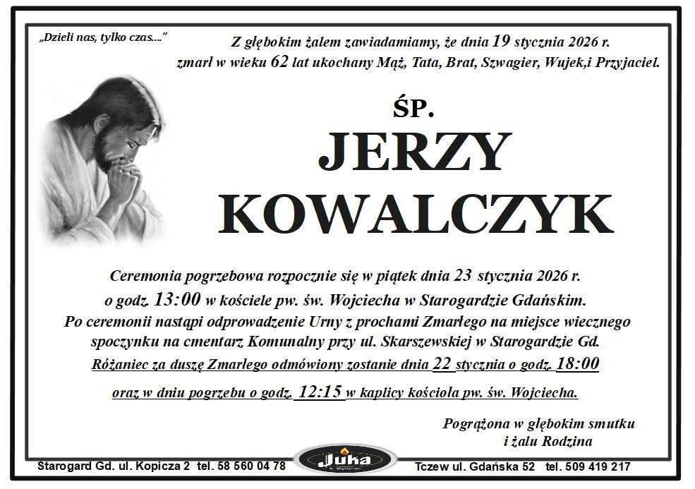 Komendant Powiatowy Państwowej Straży Pożarnej w Starogardzie Gdańskim z głębokim żalem zawiadamia, że w dniu 19 stycznia 2026 r. odszedł na wieczną służbę w wieku 62 lat śp. ppor. inż. poż. Jerzy Kowalczyk – wieloletni Komendant Zakładowej Straży Pożarnej POLPHARMA S.A.