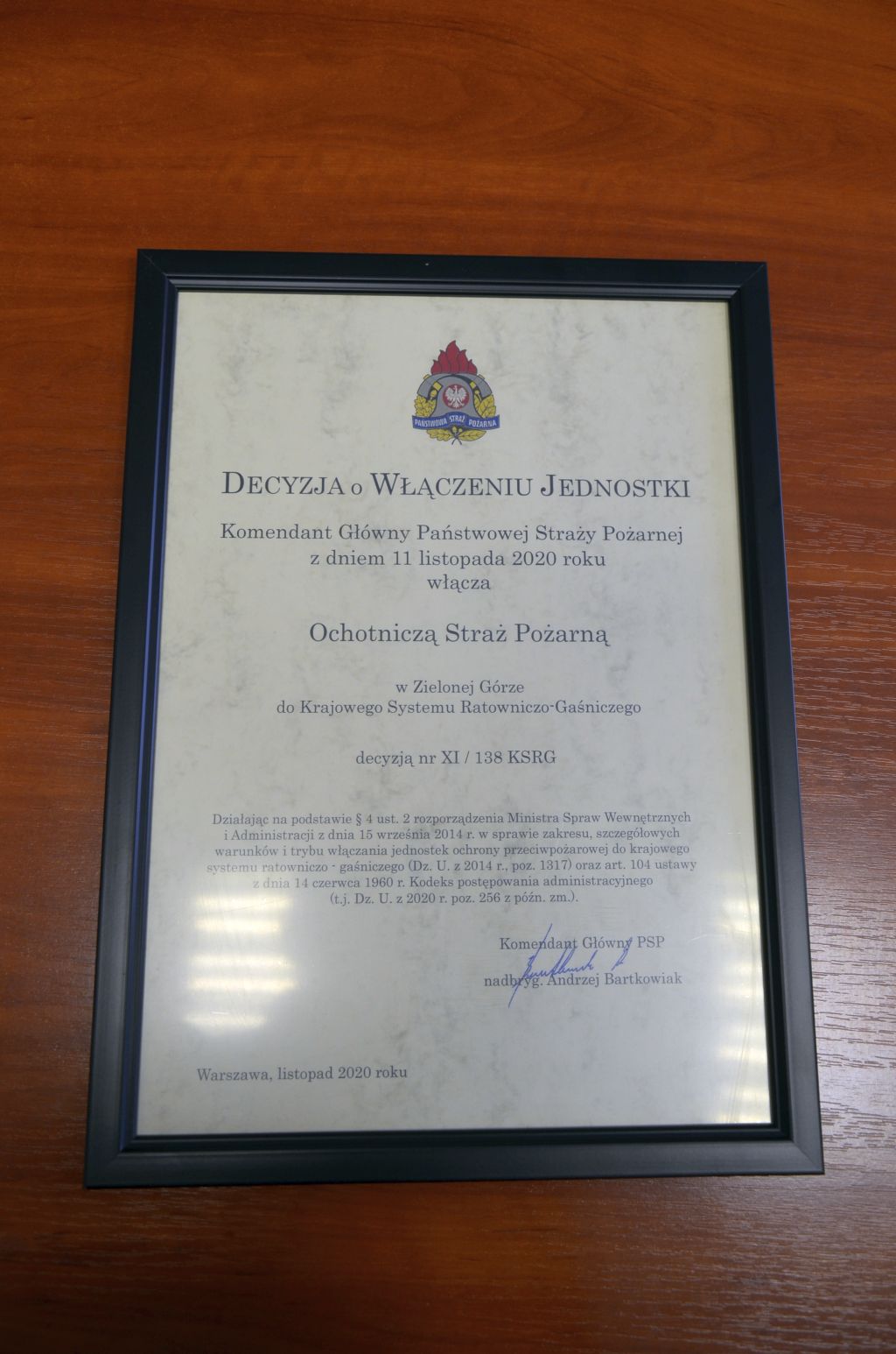 Decyzję o włączeniu do KSRG Komendant Powiatowy PSP wręczył dh Jarosławowi Buniek, prezesowi zarządu OSP Zielona Góra.