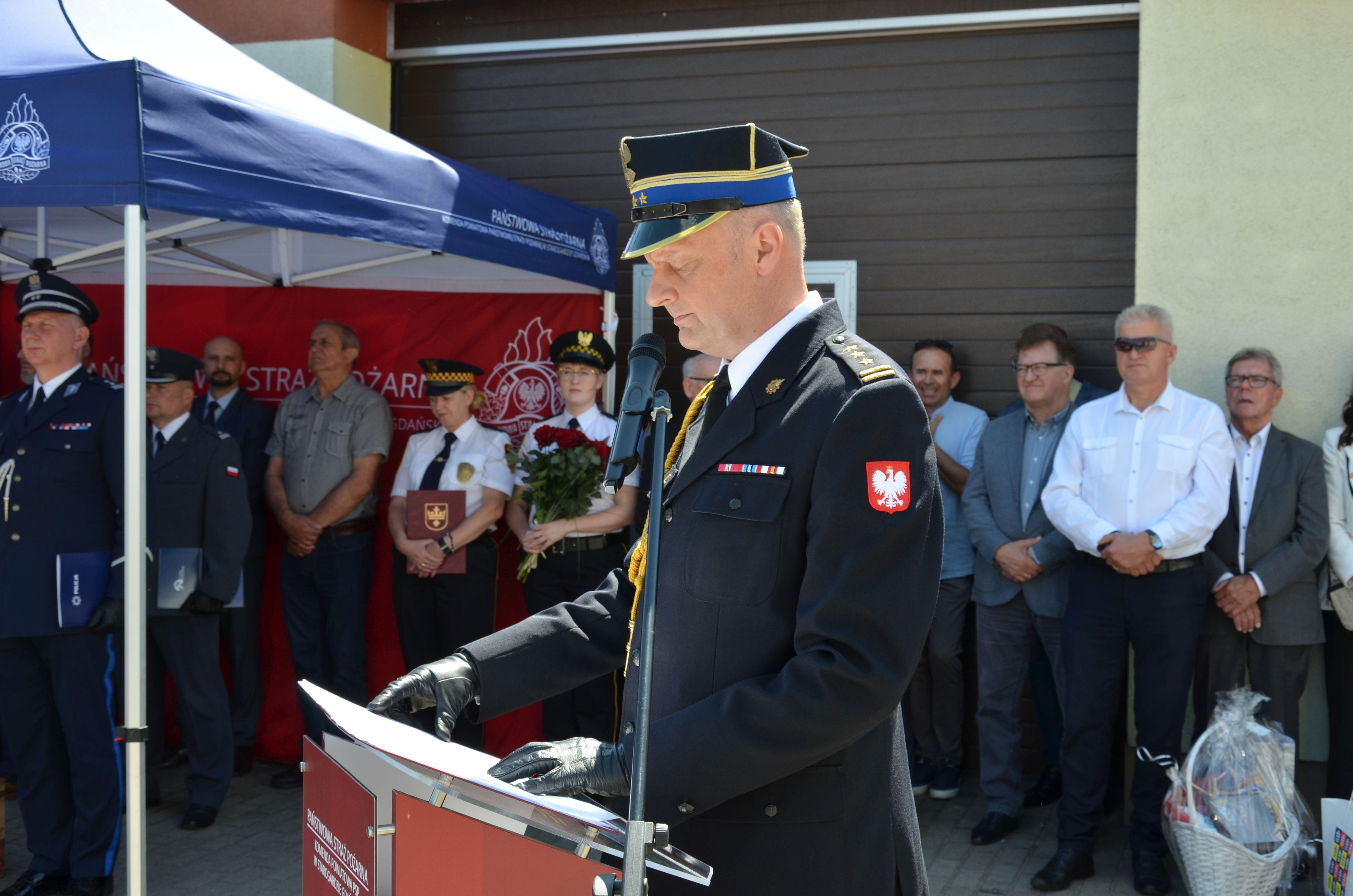 Uroczystość rozpoczął meldunek złożony Zastępcy Pomorskiego Komendanta Wojewódzkiego Państwowej Straży Pożarnej w Gdańsku st. bryg. Bartłomiejowi Mollin przez dowódcę uroczystości mł. bryg. Tomasza Nowak. Następnie Komendant Powiatowy Państwowej Straży Pożarnej w Starogardzie Gdańskim st. bryg. Tomasz Wardyn uczcił minutą ciszy pamięć Świętej Pamięci mł. bryg. w st. spocz. Zygmunta Łachacza i przywitał przybyłych gości.