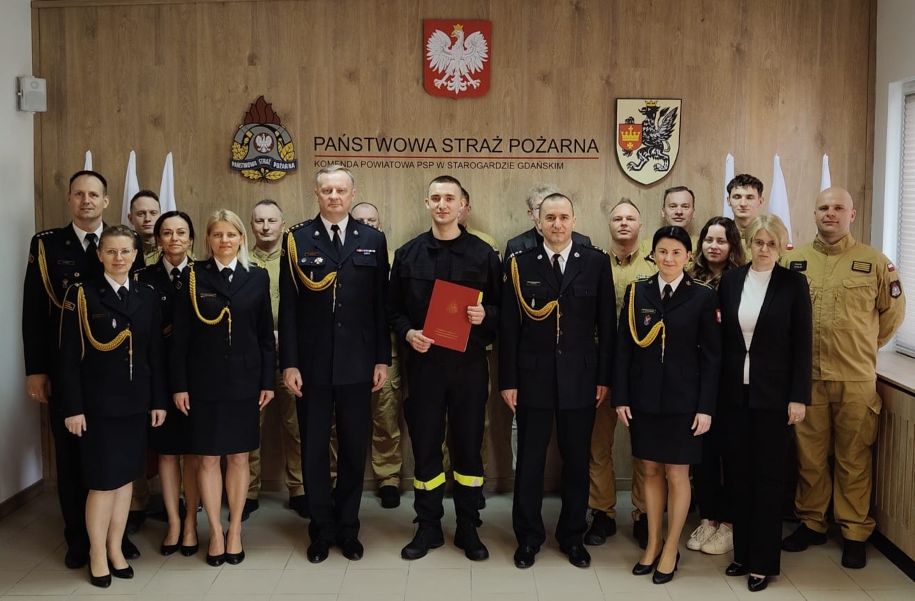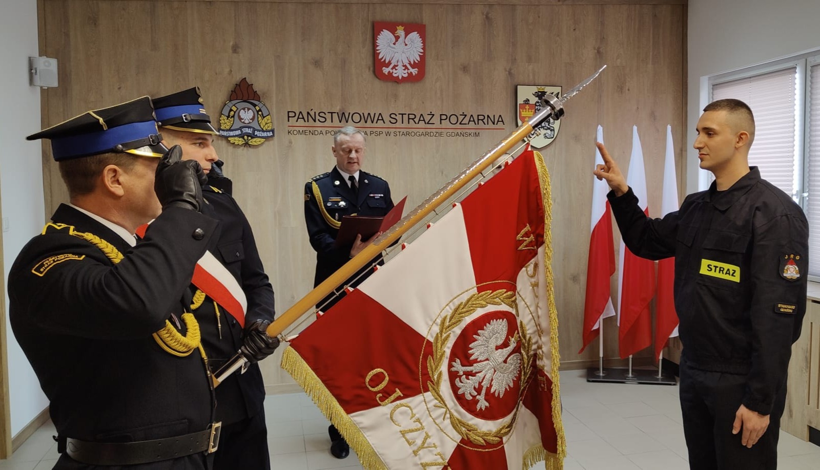20 marca 2026 roku w Komendzie Powiatowej Państwowej Straży Pożarnej w Starogardzie Gdańskim odbyła się uroczysta zbiórka z okazji ślubowania, które złożył strażak Tomasz Wiśniewski, funkcjonariusz przyjęty do służby przygotowawczej. Ślubowanie przyjął Komendant Powiatowy PSP w Starogardzie Gdańskim st. bryg. Tomasz Wardyn. Zgodnie z art. 30 ust. 1 ustawy o Państwowej Straży Pożarnej, każdy strażak Państwowej Straży Pożarnej ma obowiązek złożenia ślubowania. Jest to bardzo uroczysty moment w życiu zawodowym, stanowi symbol pełnego włączenia do cieszącej się społecznym uznaniem służby i wzmacnia świadomość własnej tożsamości zawodowej. Podejmując służbę w Państwowej Straży Pożarnej, strażak składa ślubowanie według następującej roty: