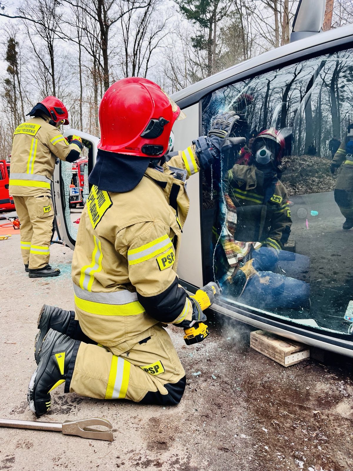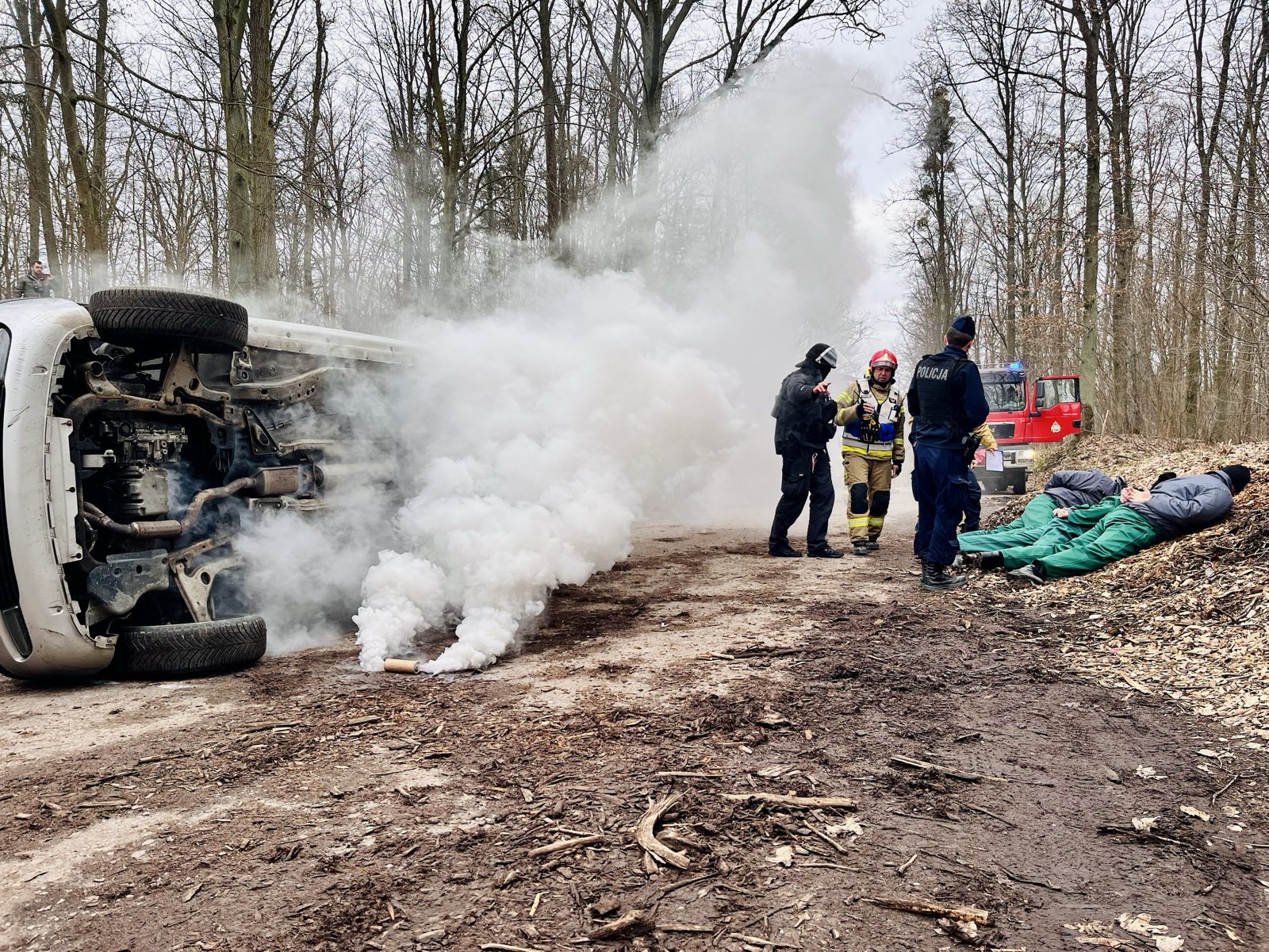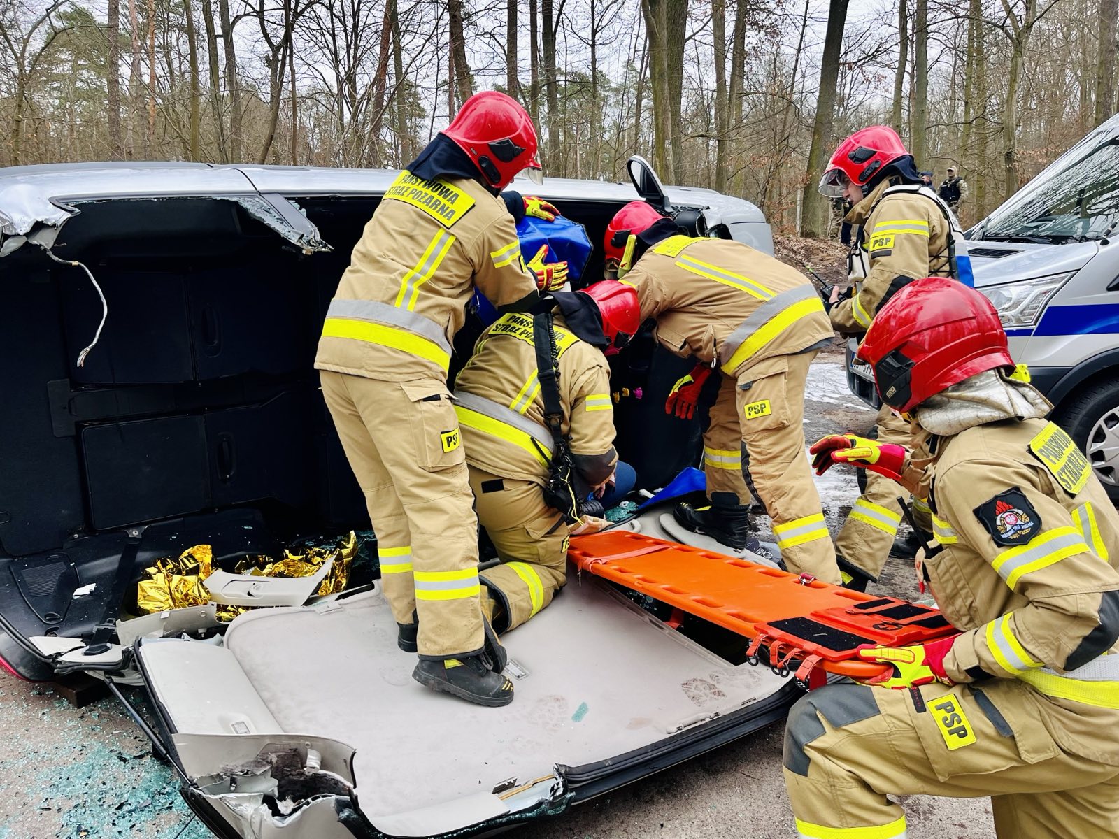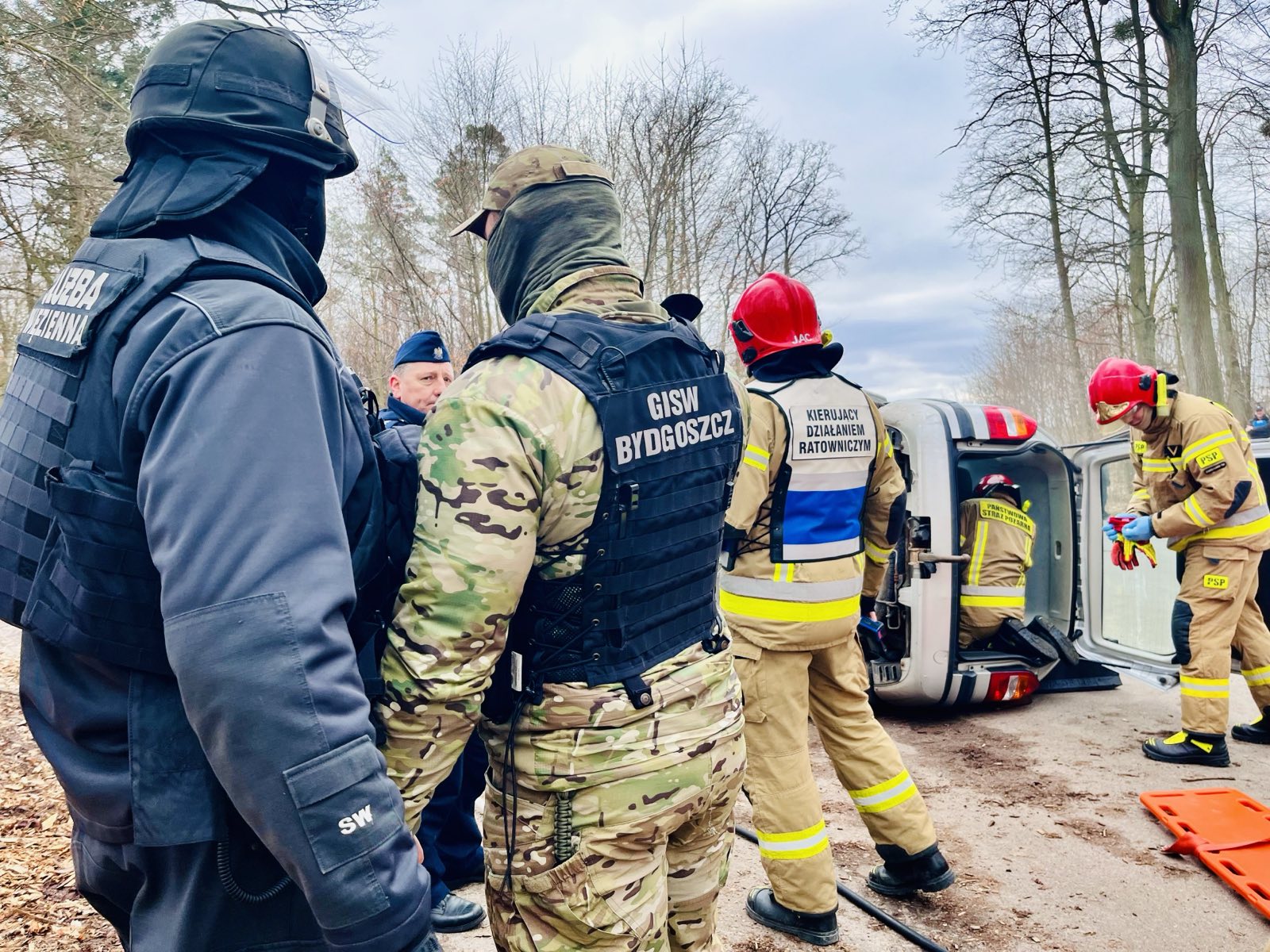 Straż pożarna zabezpieczyła miejsce zdarzenia i udzielała pomocy rannym, a policjanci ze strażą leśną i grupą pościgową służby więziennej przeczesywały tereny leśne w poszukiwaniu zbiegów.