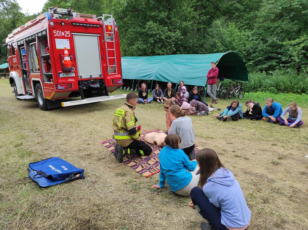 Uczestnicy obozu zapoznani zostali z zasadami bezpiecznego wypoczynku oraz procedurami udzielania pierwszej pomocy. Strażacy omówili, a także pokazali sprzęt będący wyposażeniem ciężkiego samochodu ratowniczo-gaśniczego, który pełni codzienną służbę w podziale bojowym.