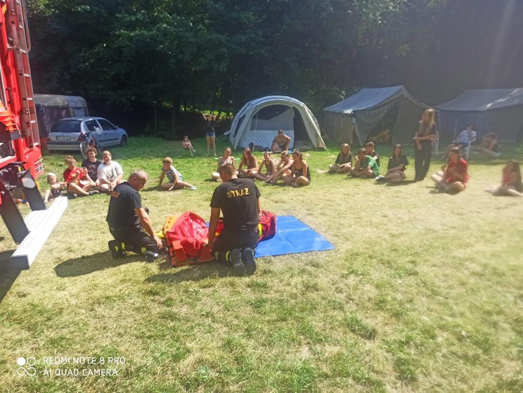 Następnie młodym obozowiczom strażacy zaprezentowali sprzęt ratowniczo- gaśniczy będący na wyposażeniu samochodu pożarniczego GCBA-Rt 5,4/32 w Staszowie. Na koniec obozowicze mogli w praktyczny sposób zapoznać się z zasadami udzielania pierwszej pomocy.