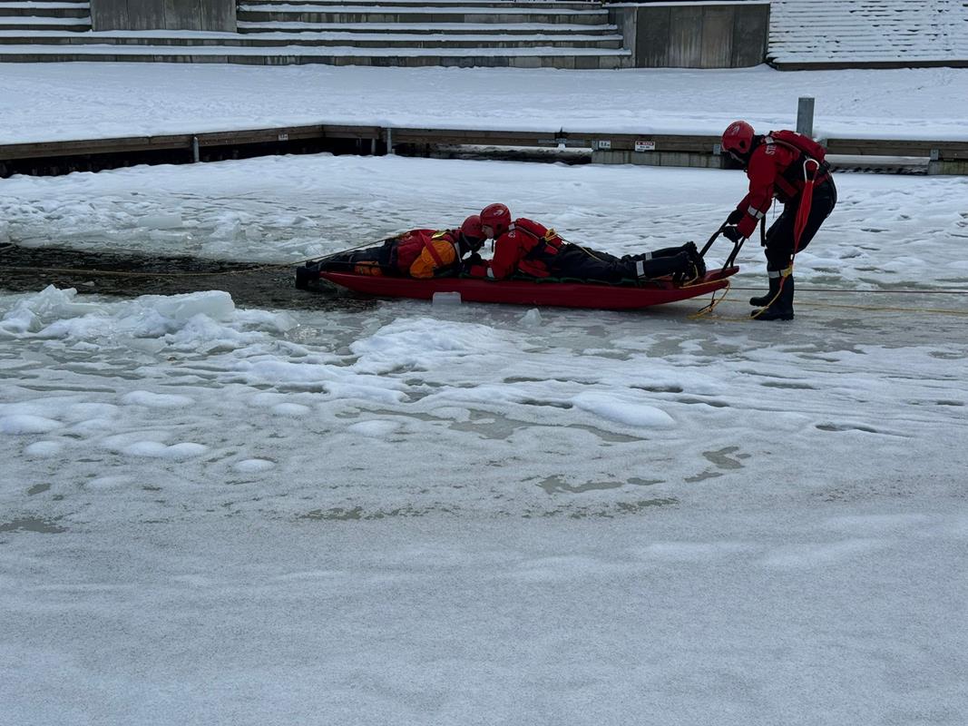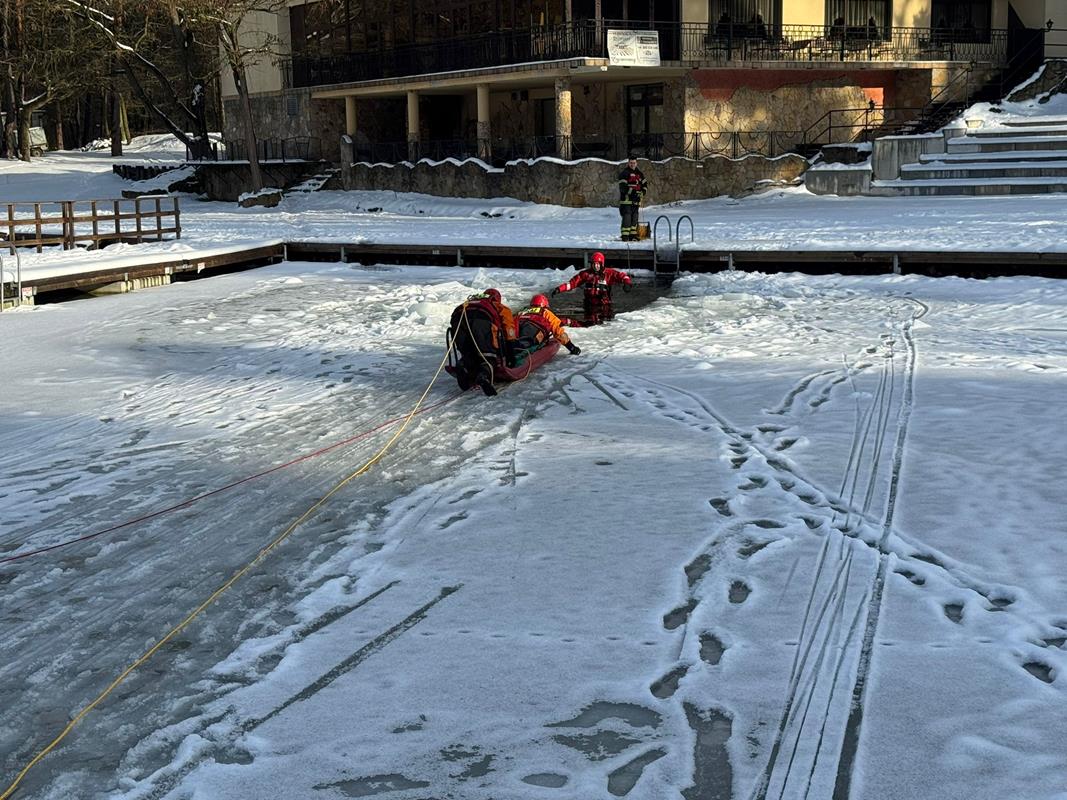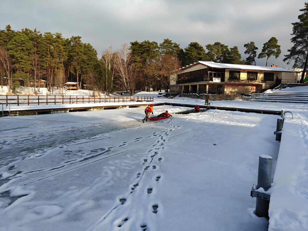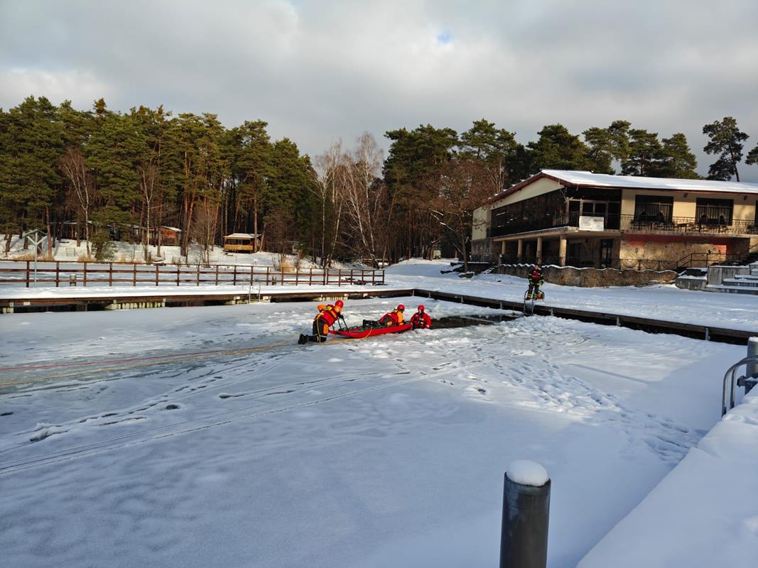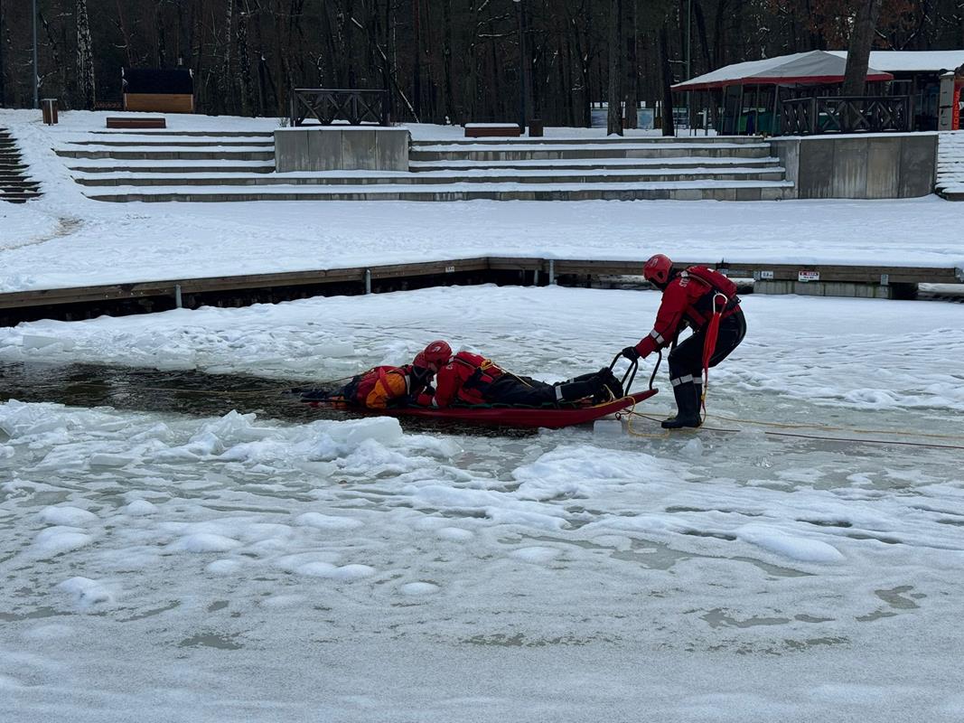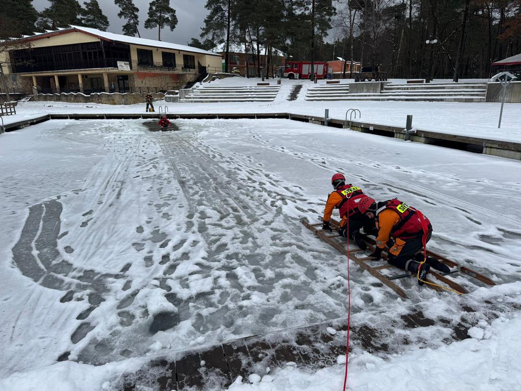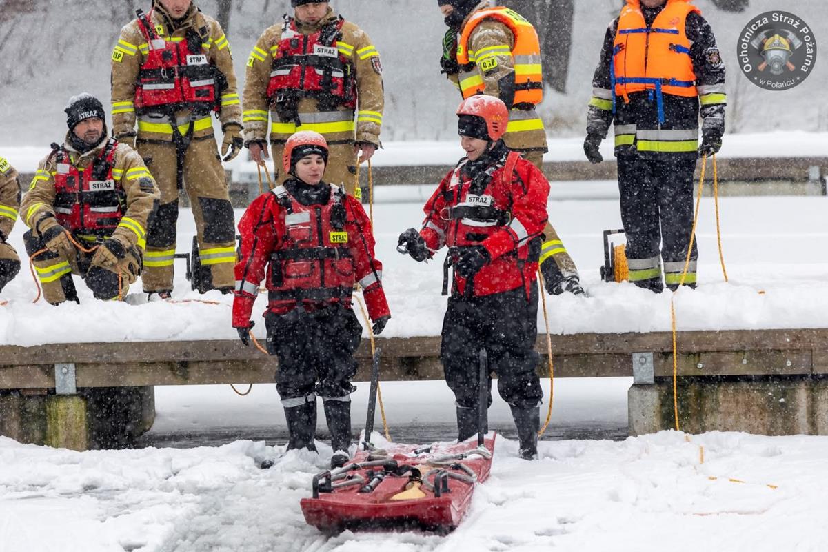 w sytuacjach załamania się lodu, sprawdzenie specjalistycznego sprzętu ratowniczego oraz doskonalenie umiejętności udzielania kwalifikowanej pierwszej pomocy osobom poszkodowanym po wpadnięciu do lodowatej wody.