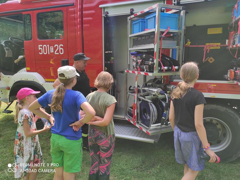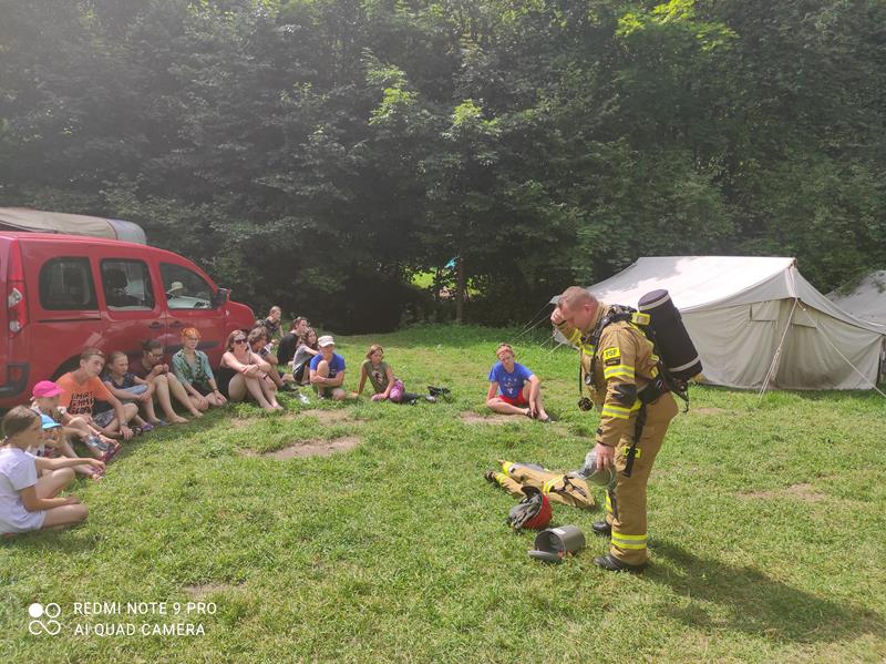 Następnie młodym obozowiczom strażacy zaprezentowali sprzęt ratowniczo- gaśniczy będący na wyposażeniu samochodu pożarniczego GCBA-Rt 5,4/32 w Staszowie. Na koniec obozowicze mogli w praktyczny sposób zapoznać się z zasadami udzielania pierwszej pomocy.