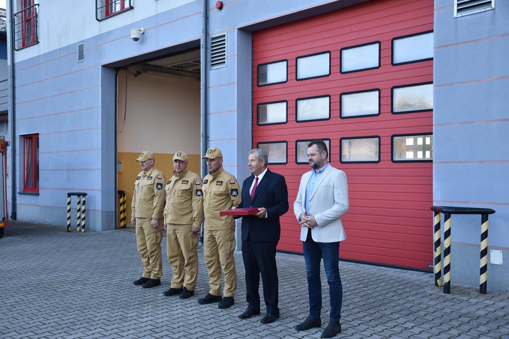 Nagroda Komendanta Głównego Państwowej Straży Pożarnej w Staszowie dla st. sekc. Damiana Nogi oraz wręczenie pamiątkowego grawertonu przez starostę staszowskiego