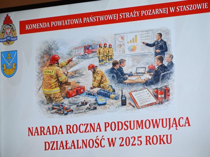 12 lutego 2026 r. w siedzibie Komendy Powiatowej Państwowej Straży Pożarnej w Staszowie odbyła się narada roczna podsumowująca działalność jednostek ochrony przeciwpożarowej z terenu powiatu staszowskiego w 2025 roku.