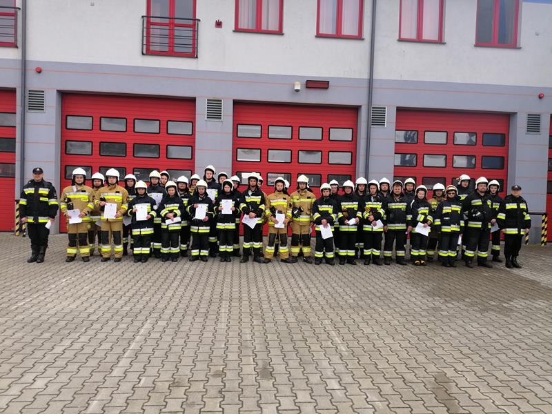 19 października 2021 roku w siedzibie Komendy Powiatowej Państwowej Straży Pożarnej w Staszowie zakończyło się szkolenie podstawowe strażaków ratowników ochotniczych straży pożarnych z terenu powiatu staszowskiego. Szkolenie rozpoczęło się spotkaniem organizacyjnym w dniu 08 września br. na którym przedstawiono ogólne zasady szkolenia oraz omówiono zasady nauczania metodą na odległość za pomocą platformy edukacyjnej. Strażacy zdobytą wiedzę teoretyczną potwierdzili egzaminem teoretycznym w dniu 21 września. Po egzaminie teoretycznym realizowany był cykl zajęć praktycznych w ramach, którego strażacy odbyli również szkolenie w komorze dymowej w Komendzie Wojewódzkiej Państwowej Straży Pożarnej w Kielcach. W dniu 13 września br. przeprowadzony został egzamin końcowy, do którego przystąpiło 37 strażaków. Po zakończonym egzaminie nastąpiła uroczysta zbiórka na której D-ca JRG w Staszowie podsumował zakończone szkolenie, pogratulował druhom jego ukończenia oraz dokonał wręczenia świadectw ukończenia szkolenia.