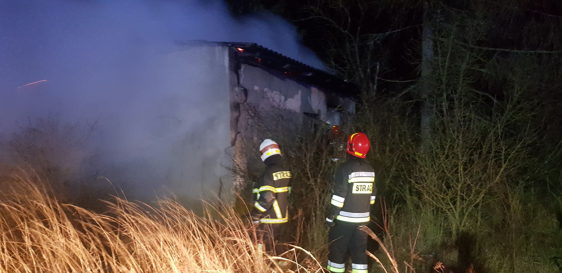 Po przybyciu na miejsce zdarzenia zastępów straży pożarnej stwierdzono, że pożarem objęty jest niezamieszkały budynek mieszkalny. Działania zastępów jednostek ochrony przeciwpożarowej polegały na zabezpieczeniu i oświetleniu miejsca zdarzenia oraz podaniu dwóch prądów wody w natarciu na palący się budynek. Po ugaszeniu pożaru przeszukano obiekt pod kątem przebywania osób postronnych oraz przystąpiono do rozbiórki nadpalonych elementów konstrukcyjnych dachu z jednoczesnym przelewaniem ich wodą. Pogorzelisko sprawdzono kamerą termowizyjną na obecność ukrytych zarzewi ognia.