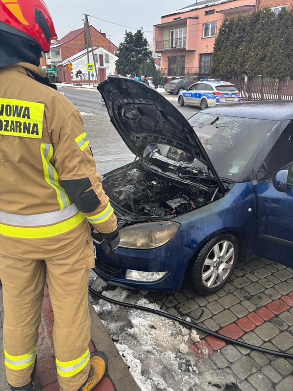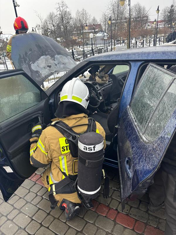 Po przybyciu na miejsce zdarzenia stwierdzono, że pożarem objęta jest komora silnika samochodu znajdującego się na parkingu. Brak osób poszkodowanych. Działania strażaków polegały na zabezpieczeniu miejsca zdarzenia i podaniu jednego prądu piany ciężkiej w natarciu na źródło pożaru. Po ugaszeniu pożaru przystąpiono do przelania komory silnika wodą, odłączenia akumulatora oraz sprawdzenia pojazdu kamerą termowizyjną na obecność ukrytych zarzewi ognia.