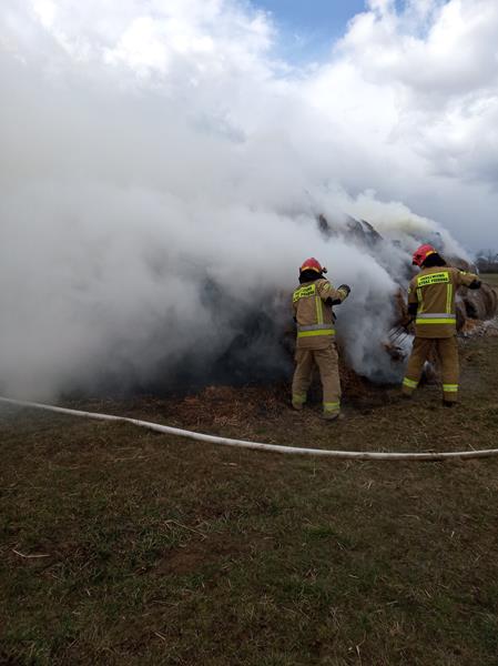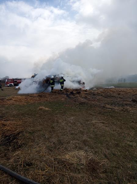 Dyżurny SK KP PSP w Staszowie niezwłocznie do działań zadysponował 4 zastępy z jednostek ochrony przeciwpożarowej. Po przybyciu na miejsce zdarzenia zastępów straży pożarnej stwierdzono, pali się stóg słomy składający się z około 100 balotów. Działania zastępów straży pożarnej polegały na zabezpieczeniu miejsca zdarzenia oraz podaniu trzech prądów wody w natarciu na palący się stóg. W celu zaopatrzenia wodnego na potrzeby prowadzonych działań gaśniczych została zbudowana linia zasilająca z hydrantu umiejscowionego w odległości około 300 metrów od miejsca pożaru. Po ugaszeniu pożaru przystąpiono do przerzucania i przelewania nadpalonej słomy. Pogorzelisko sprawdzono kamerą termowizyjną na możliwość wystąpienia ukrytych zarzewi ognia. Działania ratowniczo-gaśnicze trwały ponad 5 godzin. W działaniach ratowniczych udział brał 1 zastęp z jednostki ratowniczo-gaśniczej w Staszowie oraz 3 zastępy z jednostek ochotniczych straży pożarnych.
