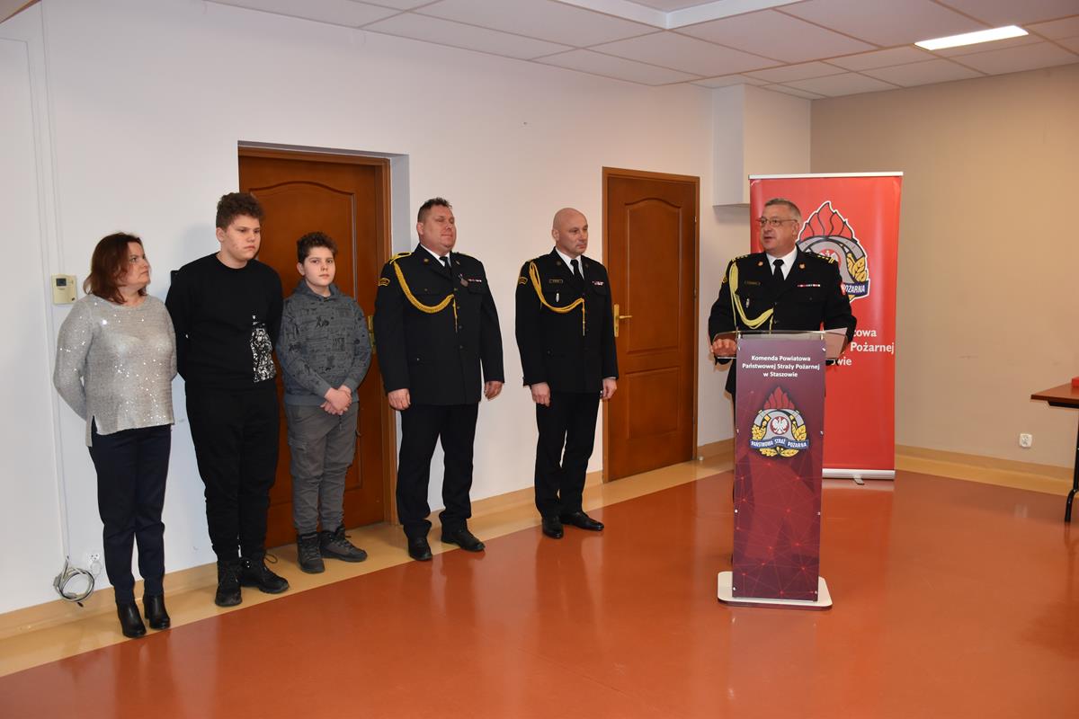 Następnie Komendant Powiatowy PSP w Staszowie st.bryg. Rafał Gajewicz przybliżył zebranym drogę kariery zawodowej strażaka odchodzącego na zaopatrzenie emerytalne oraz wręczył okolicznościowe grawertony w podziękowaniu za wieloletnią służbę.