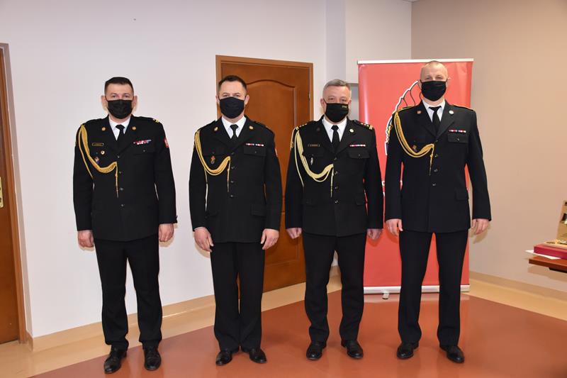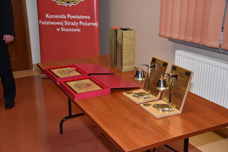Następnie Komendant Powiatowy PSP w Staszowie st.bryg. Rafał Gajewicz przybliżył zebranym drogę kariery zawodowej strażaków odchodzących na zaopatrzenie emerytalne oraz wręczył okolicznościowe grawertony w podziękowaniu za wieloletnią służbę.