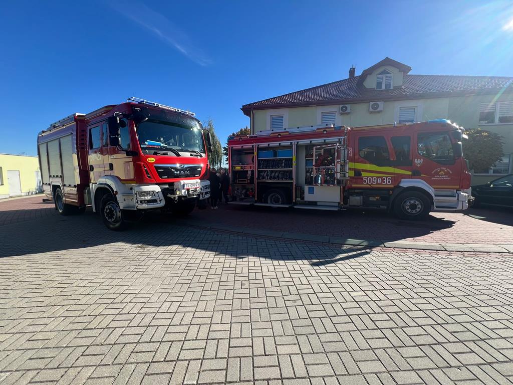 Po sprawnie przeprowadzonej ewakuacji zapoznano uczestników z procedurami dotyczącymi zachowania w przypadku wybuchu pożaru lub powstania innego zagrożenia dla ich życia i zdrowia. Po opuszczeniu budynku podopieczni zostali zaznajomieni ze sprzętem jaki znajduje się na wyposażeniu wozów z JRG Staszów oraz OSP Połaniec.