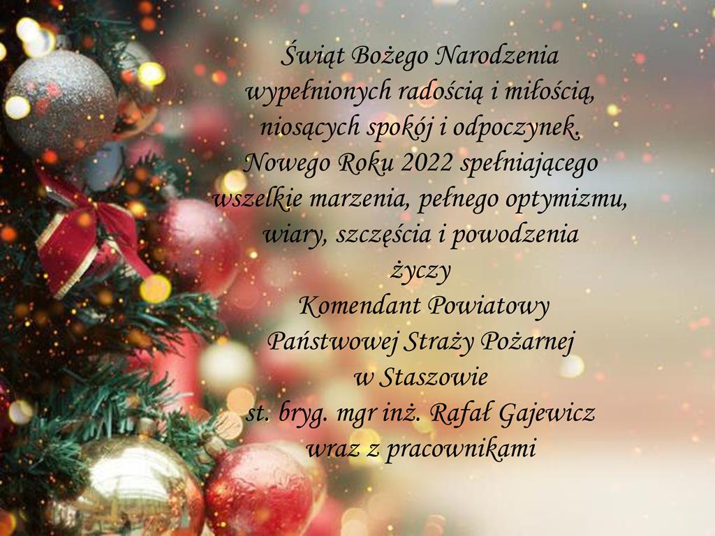 Świąteczne Życzenia Komendanta Powiatowego PSP w Staszowie 24.12.2021 Zdjęcia (1) Pokaż zdjęcie 1 z galerii.