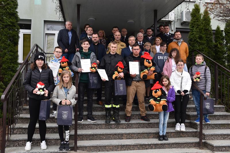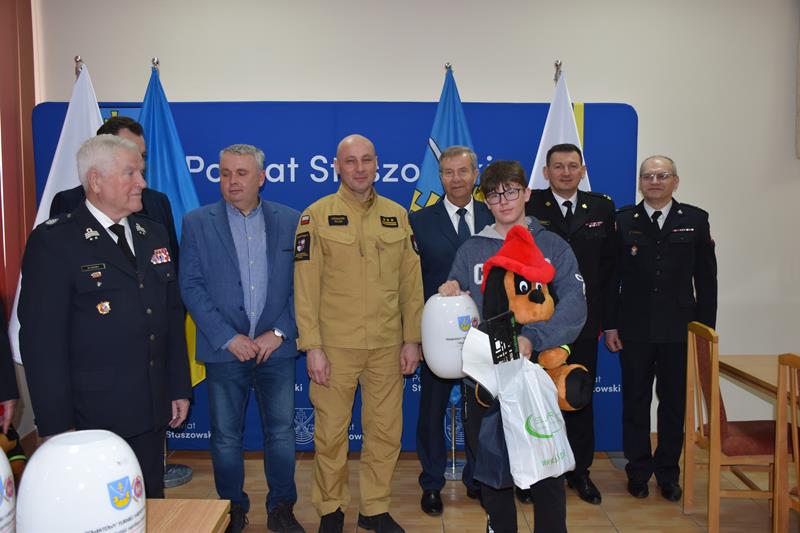 Na zakończenie odczytano nazwiska laureatów tegorocznej edycji konkursu na szczeblu powiatowym w poszczególnych grupach wiekowych. Nagrody wręczyli i podziękowali uczestnikom za udział z-ca Komendanta Wojewódzkiego a zarazem prezes ZPO OSP RP w Staszowie st. bryg Grzegorz Rajca, z-ca Komendanta Powiatowego PSP w Staszowie mł. bryg. Jarosław Juszczyk, starosta staszowski pan Józef Żółciak oraz sponsorzy nagród.