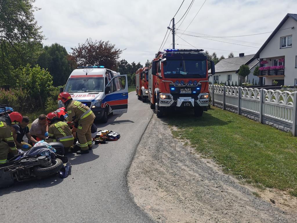Po przybyciu na miejsce zdarzenia zastępów straży pożarnej stwierdzono, że doszło do zderzenia skutera z motocyklem. Pojazdami podróżowało 3 osoby. Działania ratowników jednostek ochrony przeciwpożarowej polegały na zabezpieczeniu miejsca zdarzenia i udzieleniu kwalifikowanej pierwszej pomocy kierującym pojazdami oraz pasażerce . Po przebadaniu przez ratowników medycznych, osoby poszkodowane zostały zabrane do szpitala