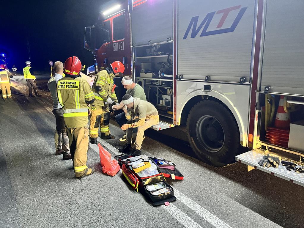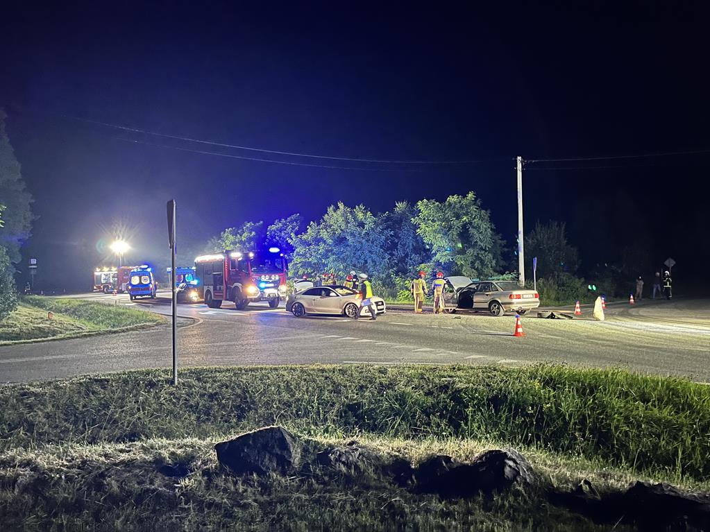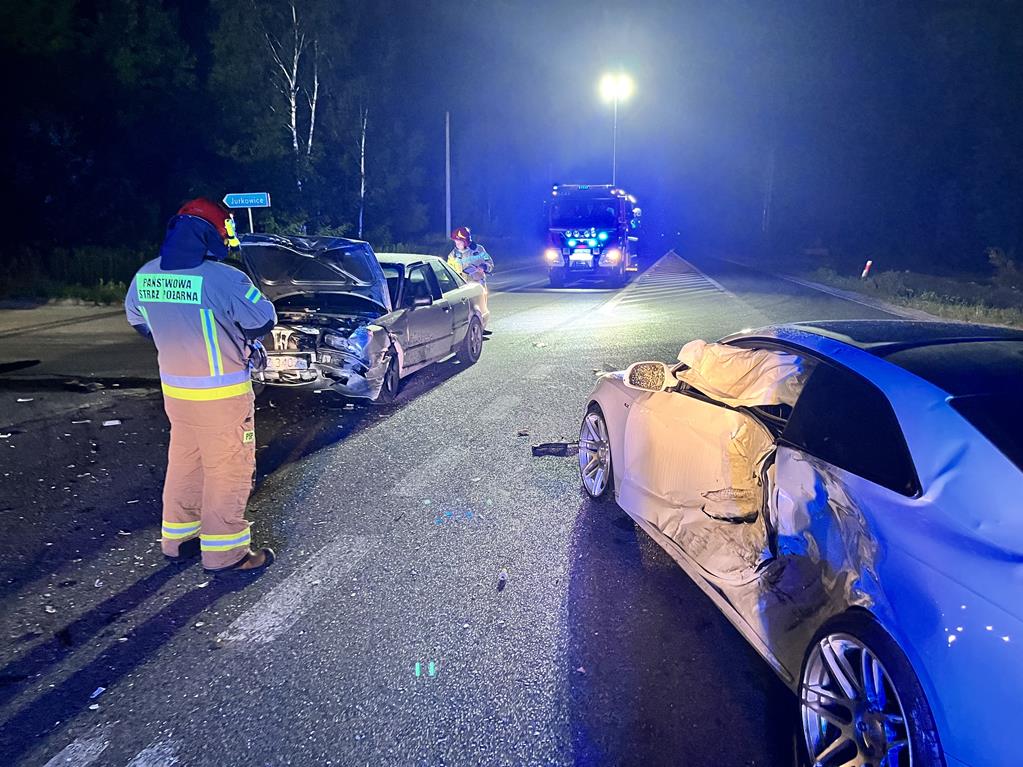 Po przybyciu na miejsce zdarzenia zastępów straży pożarnej stwierdzono, że doszło do zderzenia dwóch samochodów osobowych. Pojazdami łącznie podróżował szczęść osób. Działania ratowników polegały na zabezpieczeniu miejsca zdarzenia i udzieleniu kpp wszystkim uczestnikom zdarzenia. Dalsze działania zastępów JOP polegały na odłączeniu akumulatorów w pojazdach oraz neutralizacji i sorpcji płynów pokolizyjnych. Po przebadaniu wszystkich uczestników biorących udział w zdarzeniu trzy osoby zostały odwiezione do szpitala.