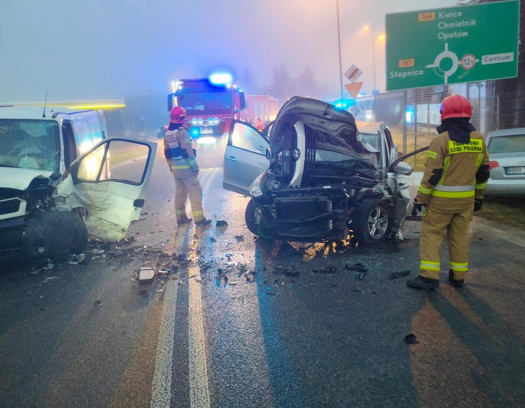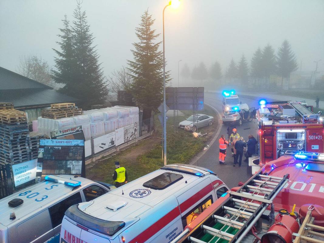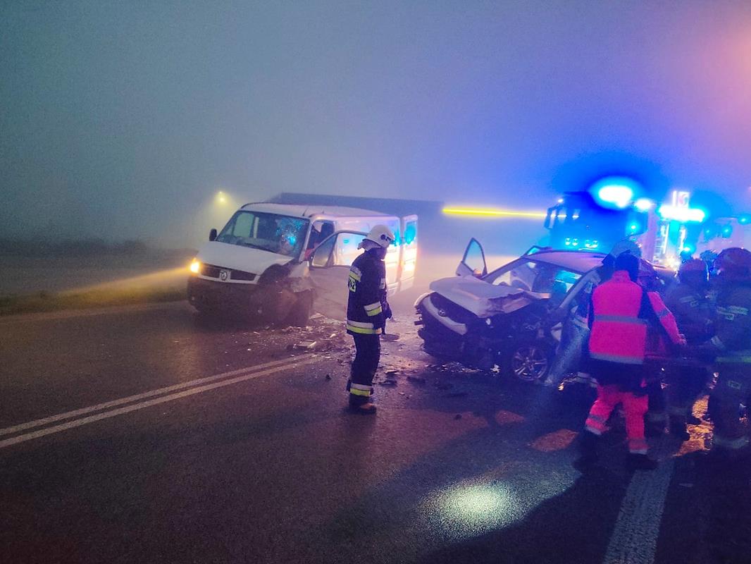 Po przybyciu na miejsce zdarzenia zastępów straży pożarnej stwierdzono, że doszło do zderzenia dwóch samochodów osobowych oraz jednego samochodu dostawczego. Pojazdami podróżowało łącznie 10 osób. Działania straży pożarnej polegały na zabezpieczeniu miejsca zdarzenia oraz wykonaniu dostępu do dwóch osób znajdujących się w jednym z pojazdów przy użyciu narzędzi hydraulicznych. Jednocześnie ratownicy jednostek ochrony przeciwpożarowej przeprowadzili wywiad medyczny z pozostałymi uczestnikami wypadku, w wyniku którego ustalono, że 3 osoby wymagają medycznych działań ratowniczych. Po przybyciu na miejsce zdarzenia ZRM wszystkie osoby zostały przekazane. Dalsze działania polegały na neutralizacji i sorpcji powstałej plamy płynów po kolizyjnych. W działaniach ratowniczych udział brało 5 zastępów jednostek ochrony przeciwpożarowej, 22 strażaków.