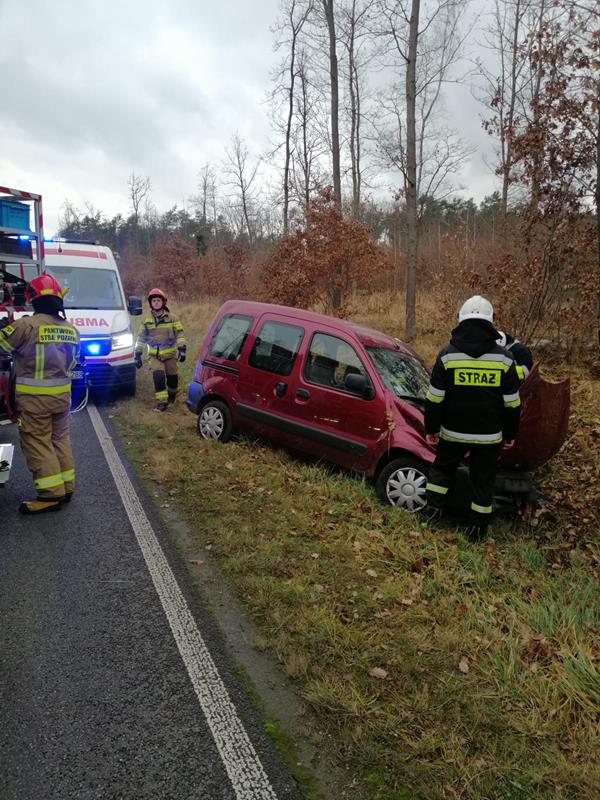 Do zdarzenia zadysponowano cztery zastępy jednostek ochrony przeciwpożarowej. Po dojeździe na miejsce zdarzenia stwierdzono, że samochód osobowy którym podróżowały dwie osoby zjechał z jezdni i znajdował się w przydrożnym rowie.