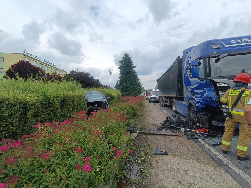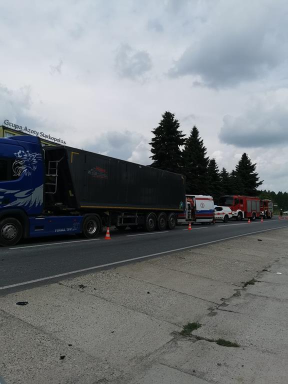 Po przybyciu na miejsce zdarzenia zastępów straży pożarnej stwierdzono, że doszło do zderzenia samochodu osobowego z samochodem ciężarowym. Pojazdami podróżowali tylko kierujący. Działania ratowników jednostek ochrony przeciwpożarowej polegały na zabezpieczeniu miejsca zdarzenia i udzieleniu kwalifikowanej pierwszej pomocy kierującemu samochodem osobowym. Po przebadaniu przez ratowników medycznych, kierujący samochodem osobowym został zabrany przez ZRM do szpitala.