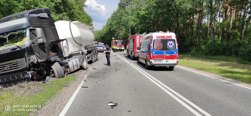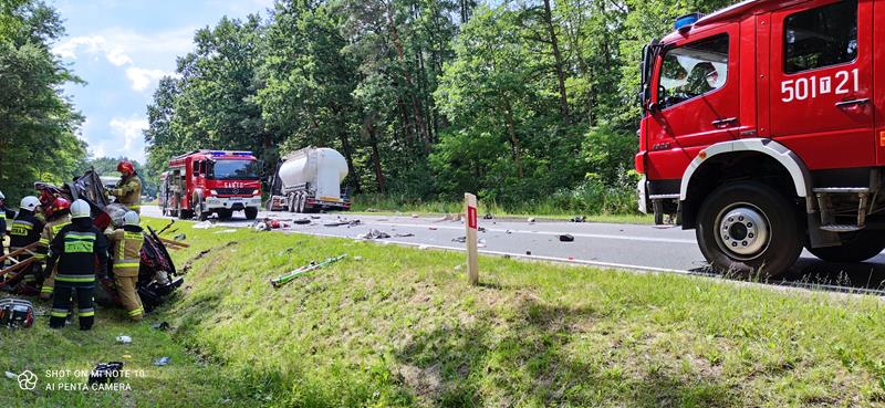 Po przybyciu na miejsce zdarzenia zastępów straży pożarnej stwierdzono, że doszło do zderzenia samochodu osobowego z samochodem ciężarowym. Pojazdami podróżowało łącznie 2 osoby. Kierujący samochodem ciężarowym opuścił pojazd przed przybyciem zastępów straży pożarnej natomiast kierowca samochodu osobowego znajdował się w pojeździe. Działania zastępów straży pożarnej polegały na zabezpieczeniu miejsca zdarzenia, udzieleniu kwalifikowanej pierwszej pomocy kierowcy ciągnika siodłowego, wykonaniu dostępu przy użyciu narzędzi hydraulicznych do kierowcy znajdującego się w pojeździe osobowym oraz transporcie wraz z ZRM osoby poszkodowanej do strefy bezpiecznej.