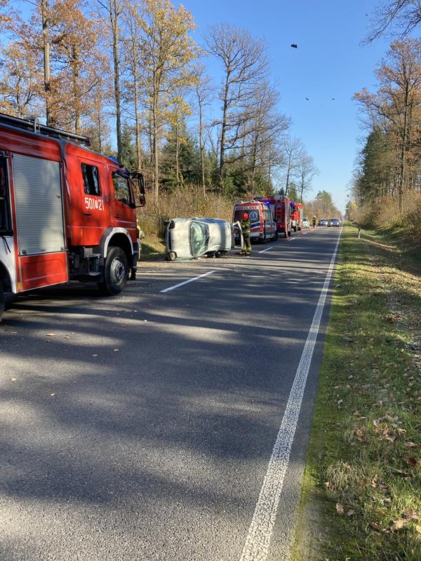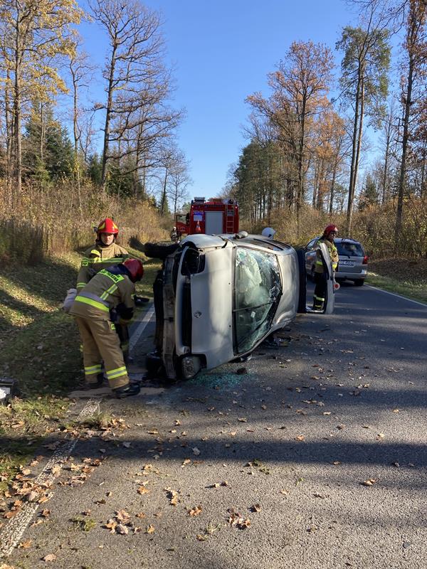 Po przybyciu na miejsce zdarzenia zastępów straży pożarnej stwierdzono, że samochód osobowy wypadł z drogi i znajduję się na boku, częściowo blokując jeden pas drogi. Pojazdem podróżowało dwie osoby. Działania strażaków-ratowników polegały na zabezpieczeniu miejsca zdarzenia, udzieleniu kwalifikowanej pierwszej pomocy podróżującym, odłączeniu akumulatorów w pojazdach, oraz sorpcji i neutralizacji płynów po kolizyjnych. Osoby uczestniczące w zdarzeniu zostały przekazane przybyłemu Zespołowi Ratownictwa Medycznego.