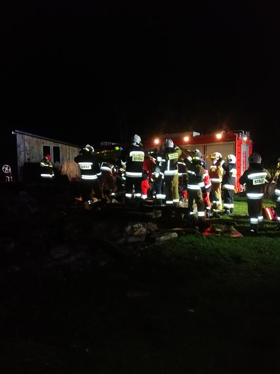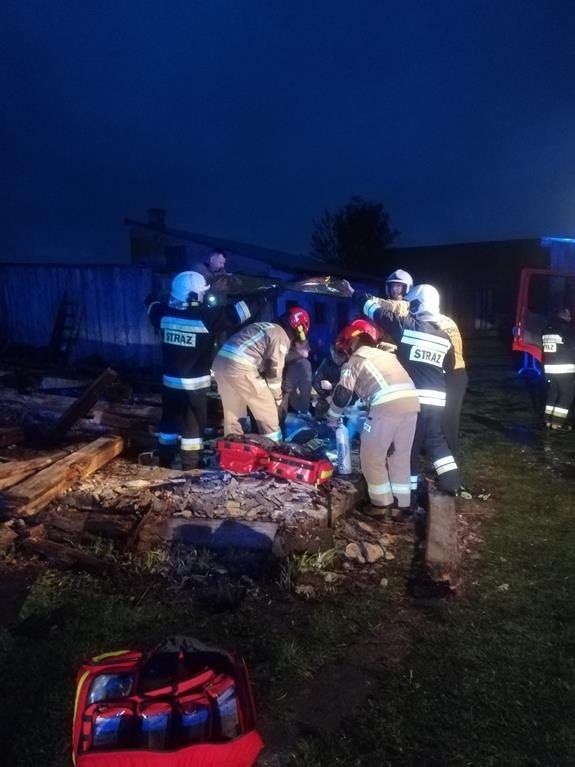Pod gruzami znajdowała się jedna osoba, która została wyciągnięta spod zawalonego budynku przed przybyciem JOP. Dyżurny do działań zadysponował strażaków z Jednostki Ratowniczo-Gaśniczej w Staszowie oraz 6 zastępów OSP. Działania strażaków polegały na zabezpieczeniu miejsca zdarzenia, resuscytacji krążeniowo – oddechowej z użyciem AED osoby poszkodowanej oraz przeszukaniu gruzowiska. Działania ratownicze trwały przez 3 godziny i 38 minut. W akcji uczestniczyło 7, zastępów 31 strażaków.