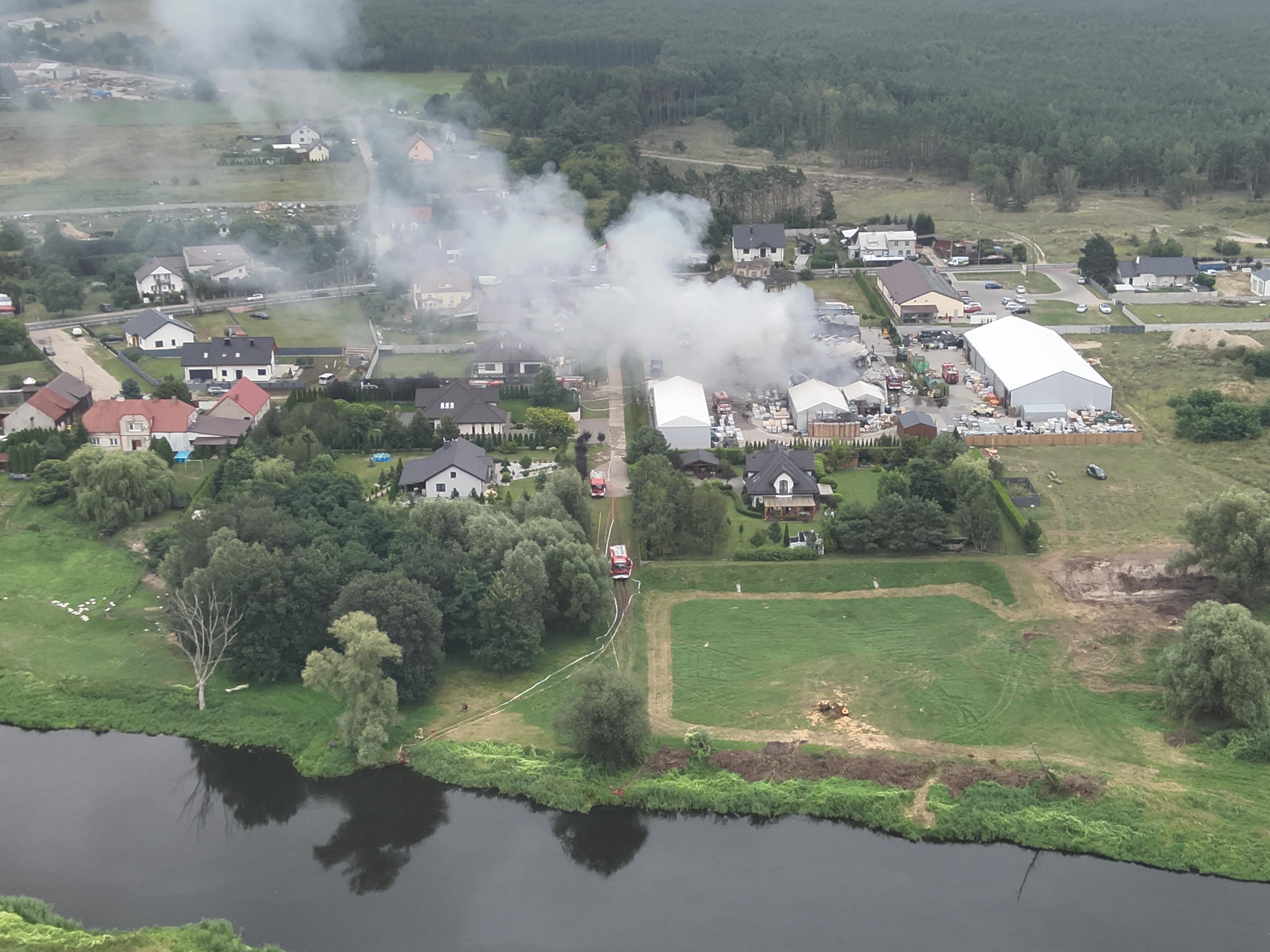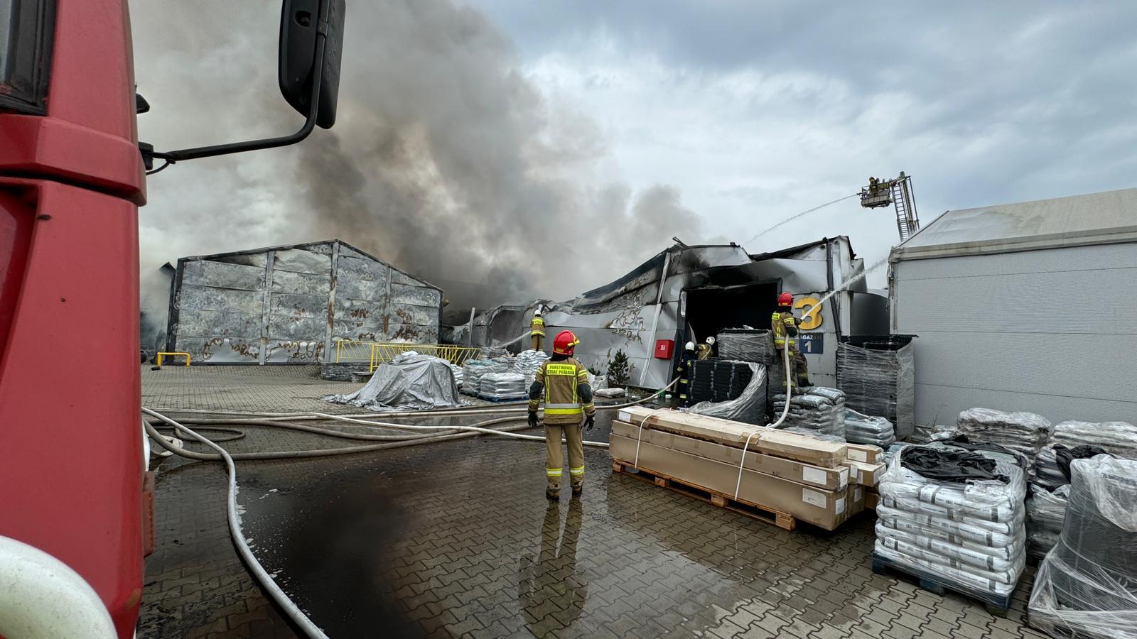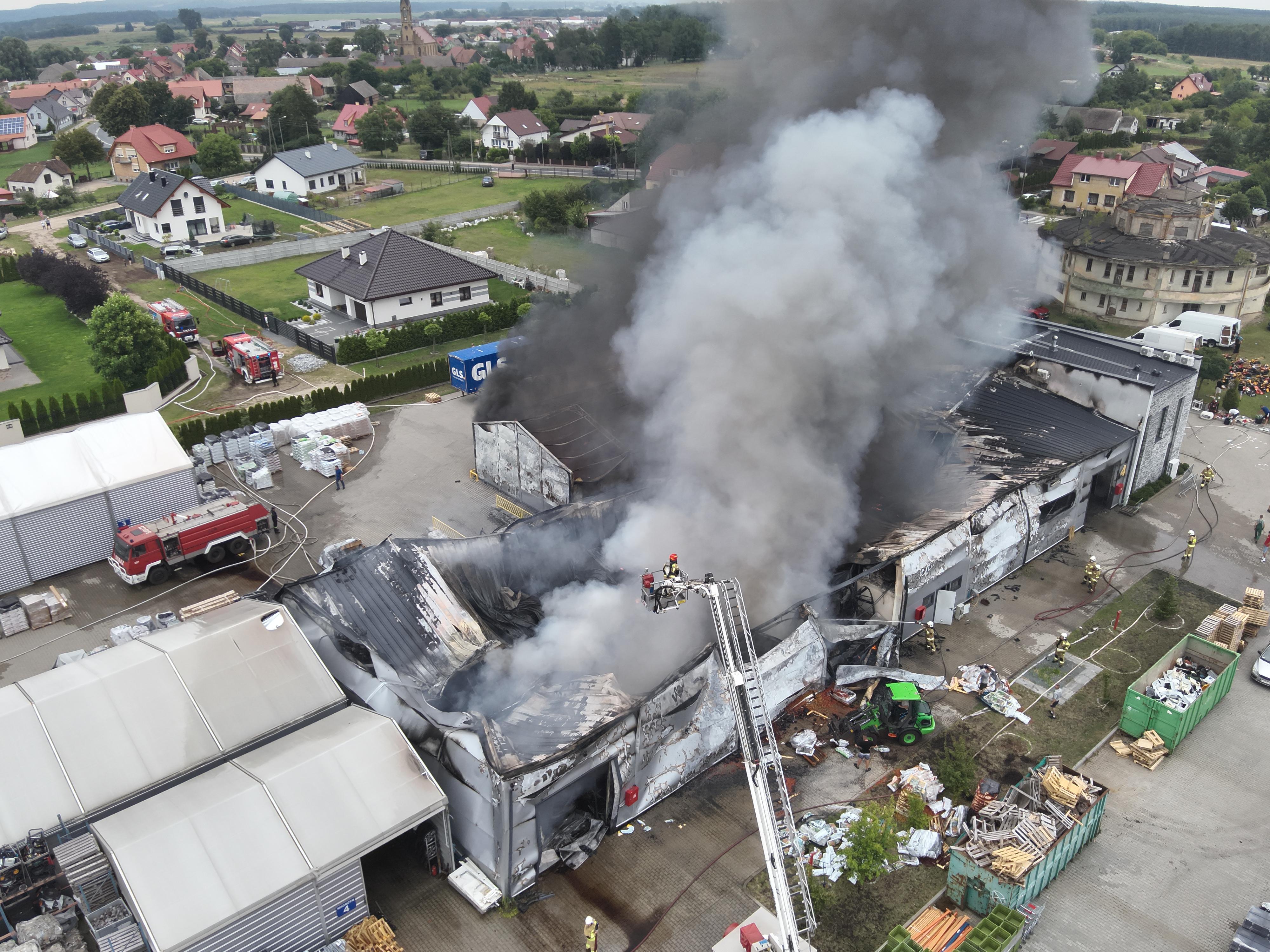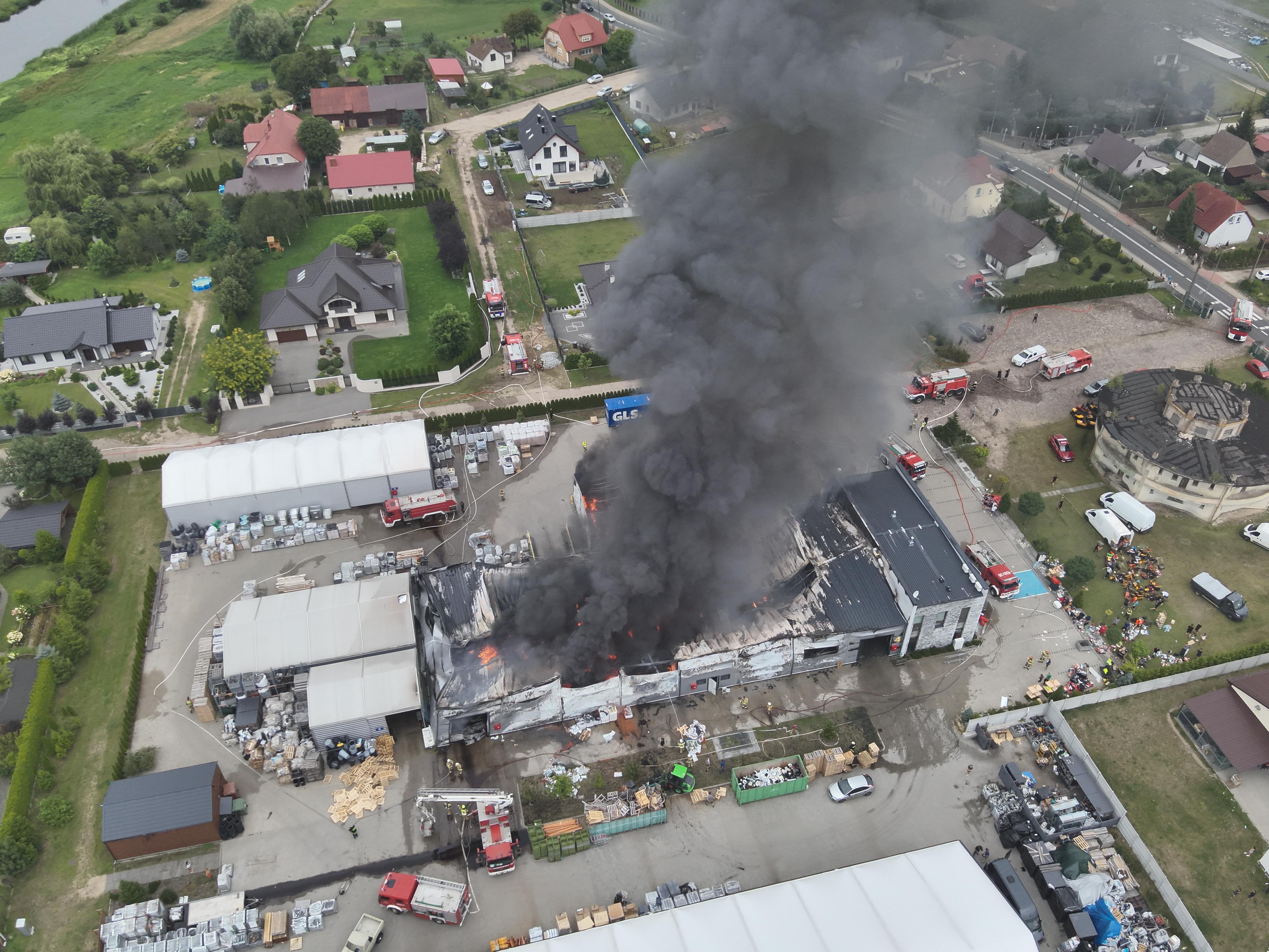 Zgłoszenie o pożarze hali magazynowej wpłynęło za pośrednictwem Wojewódzkiego Centrum Powiadamiania ratunkowego o godz. 11:42 w dniu 27.07.2024 r. Z wstępnych informacji wynikało, że pali się hala magazynowa, a płomienie widoczne są na dachu budynku. Na miejsce natychmiast zadysponowanych w pierwszy rzucie zostało 10 pojazdów gaśniczych i podnośnik oraz grupa operacyjna z dronem. W trakcie dojazdu jednostek ochrony przeciwpożarowej zadymienie z miejsca pożaru widoczne było z odległości ponad 20 km. Pierwsze zadysponowane jednostki już po 5 minutach od zgłoszenia weszły do działań.
