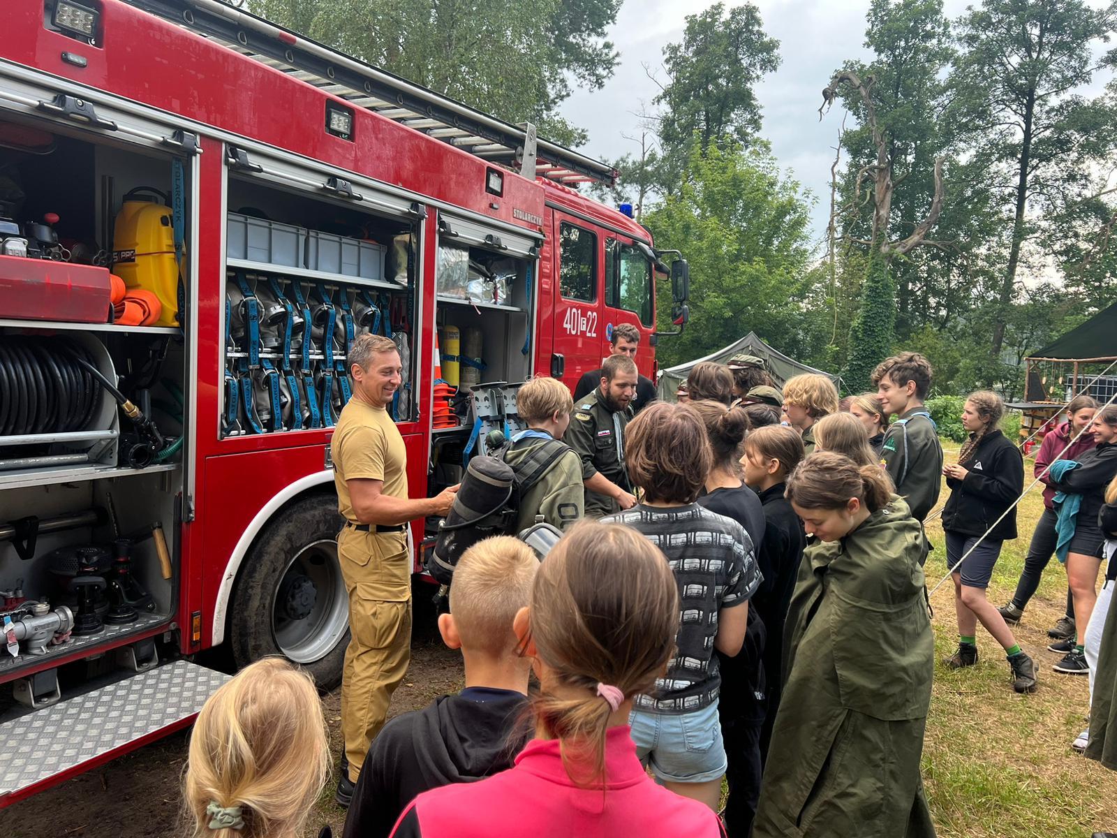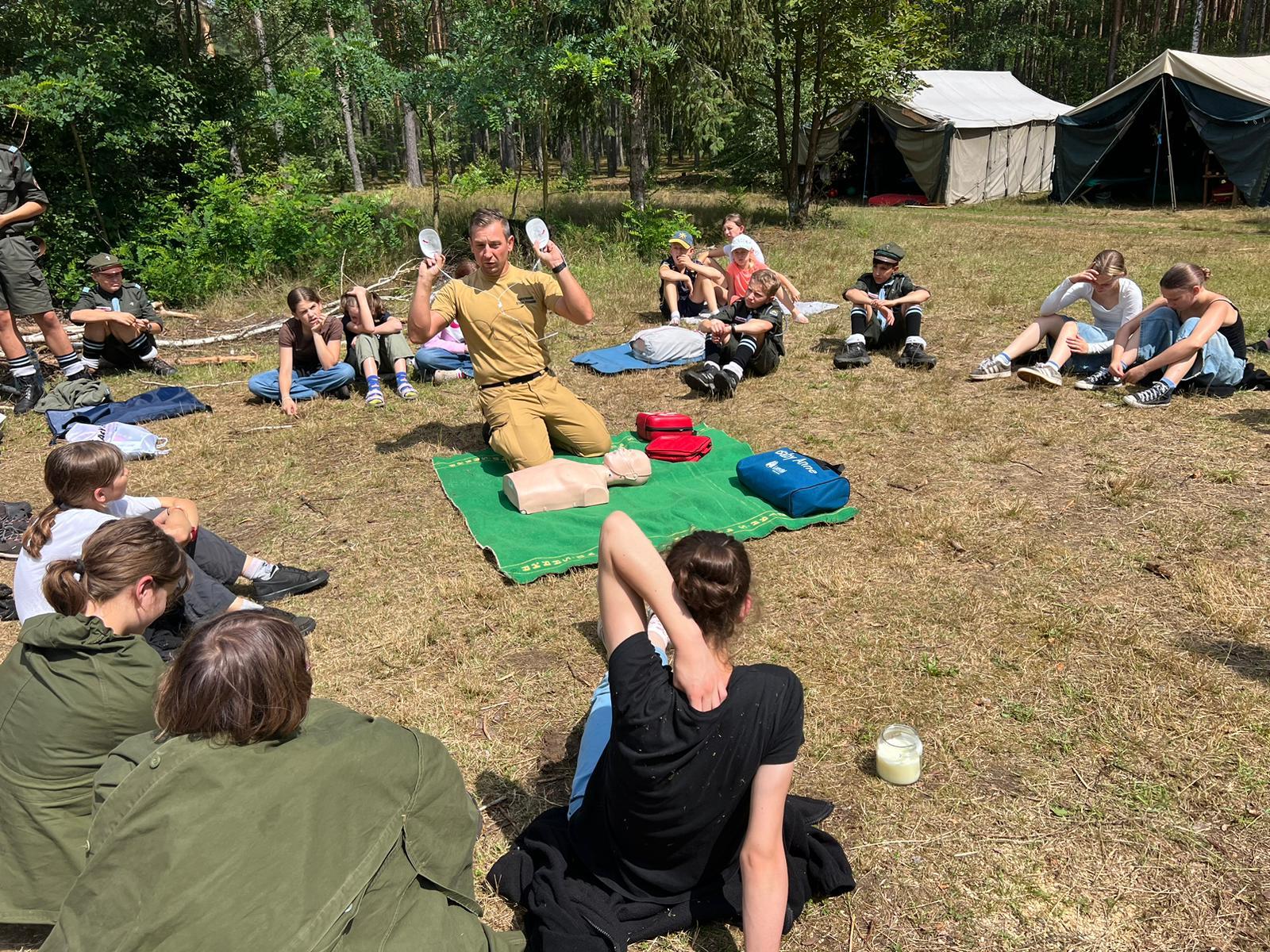 W dniu 24.07.2024 r. strażacy z KP PSP w Strzelcach Krajeńskich udali się do obozu harcerskiego znajdującego się nad jeziorem Płytkim w pobliżu miejscowości Lubiatów oraz obozu nad jeziorem Osiek w Chomętowie. Celem wizyty funkcjonariuszy było omówienie działania w sytuacjach kryzysowych takich jak pożar lasu czy silne porywy wiatru. Przypomniano numery alarmowe, zaprezentowano i omówiono zasady udzielania pierwszej pomocy. Dodatkowo uczestnicy obozu mieli możliwość zapoznania się ze sprzętem będącym na wyposażaniu samochodu gaśniczego GBA MAN 2,5/25. Na zakończenie harcerze mogli spróbować swoich sił w wykorzystywaniu sprzętu gaśniczego w praktyce. Przypomniano również o konieczności sprawdzania łączności ze Stanowiskiem Kierowania Komendanta Powiatowego PSP w Strzelcach Krajeńskich oraz monitorowania sytuacji meteorologicznej.