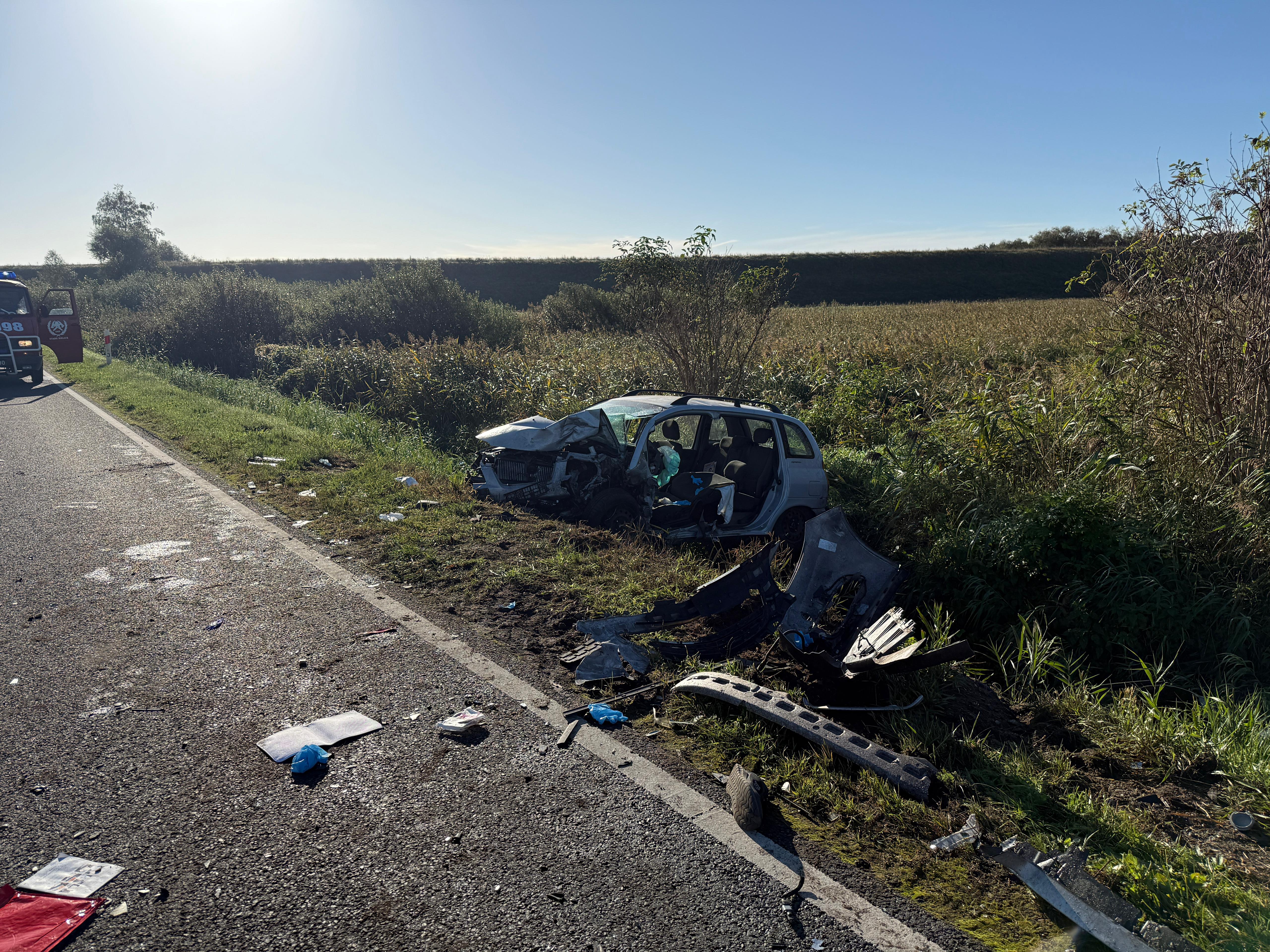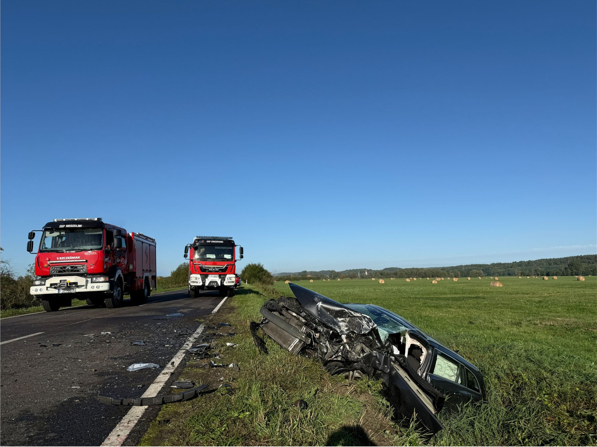Do groźnego zdarzenia doszło na drodze wojewódzkiej nr 174 niedaleko miejscowości Kosin, gdzie zderzyły się dwa samochody osobowe – Opel Insignia i Hyundai Matrix. Siła uderzenia była tak duża, że oba pojazdy wypadły z jezdni i zatrzymały się w przydrożnych rowach.