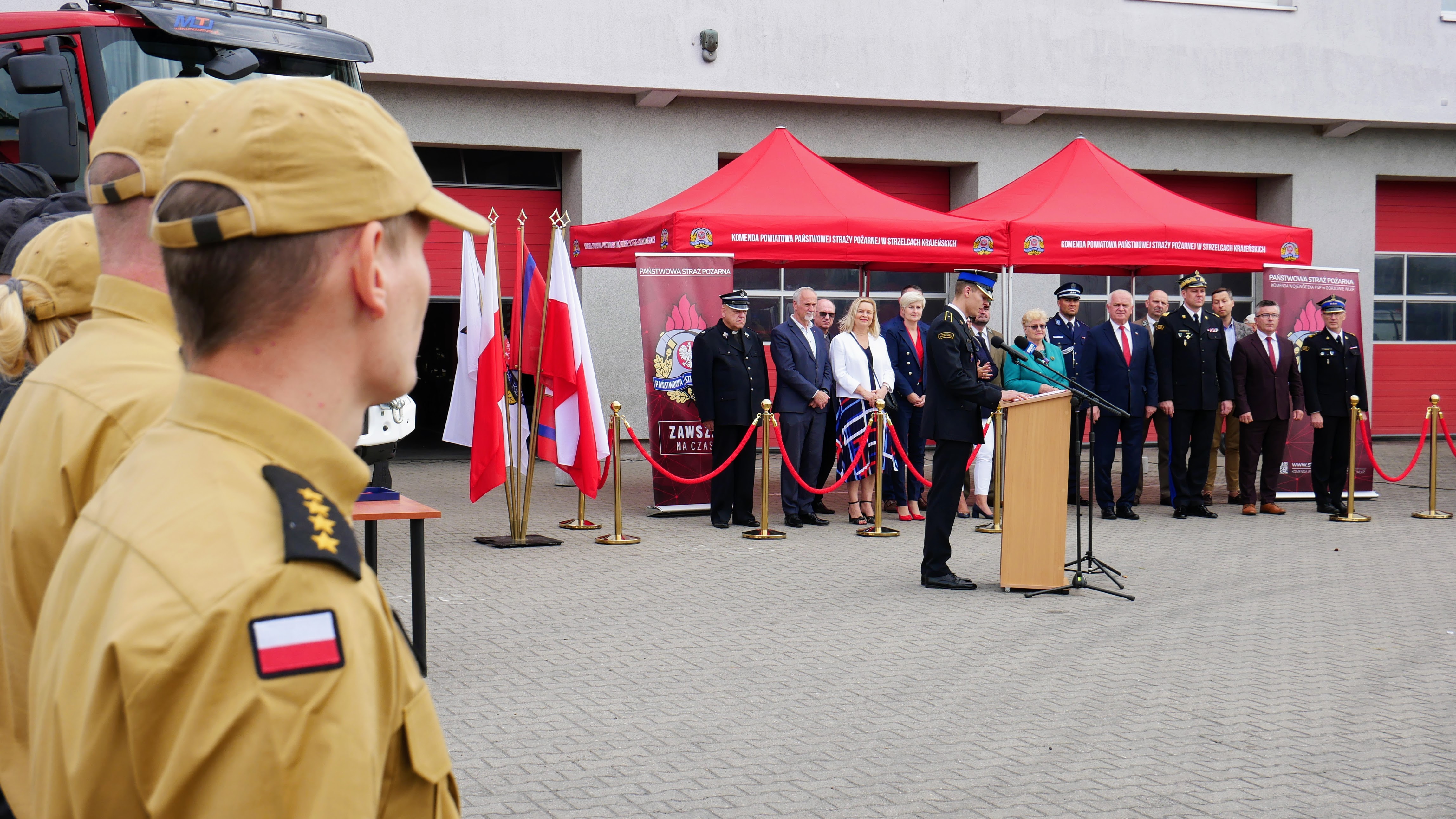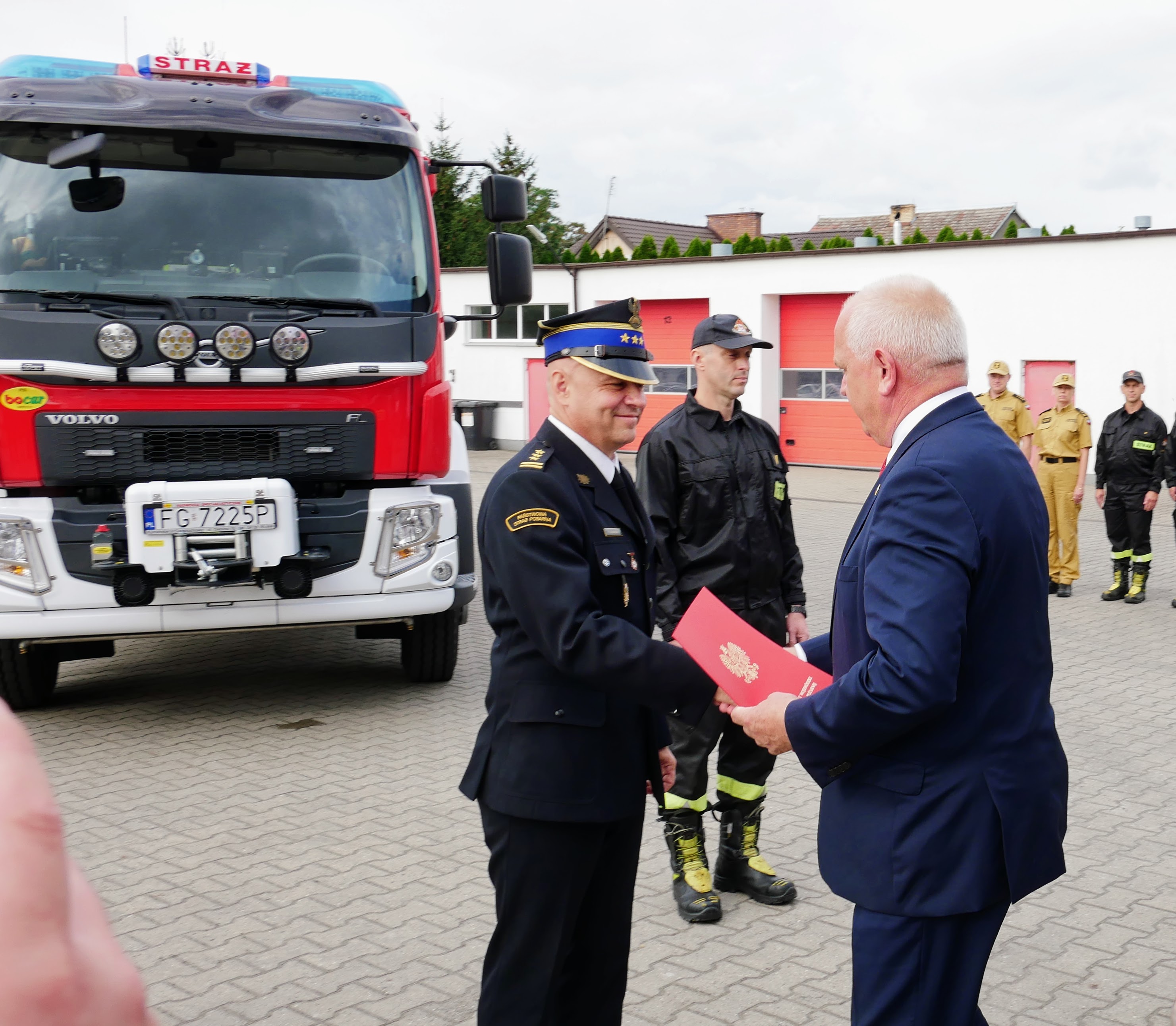 Na placu przed Komendą Powiatową Państwowej Straży Pożarnej, Lubuski Komendant Wojewódzki PSP nadbryg. Patryk Maruszak wraz z Wojewodą Lubuskim Władysławem Dajczakiem oraz Posłem na Sejm RP Elżbietą Płonką, wręczył akt przekazania pojazdu Komendantowi Powiatowemu PSP w Strzelcach Krajeńskich st. bryg. Tomaszowi Górniakowi.
