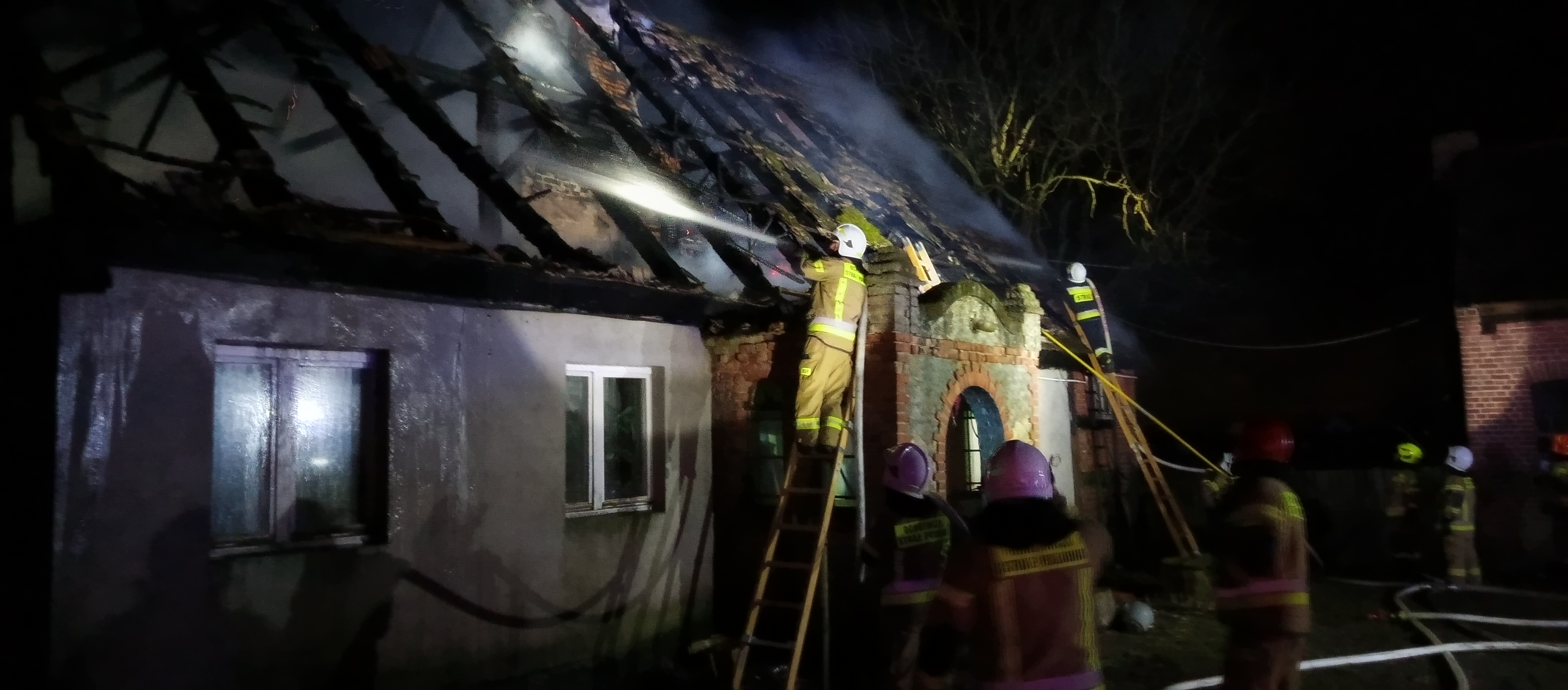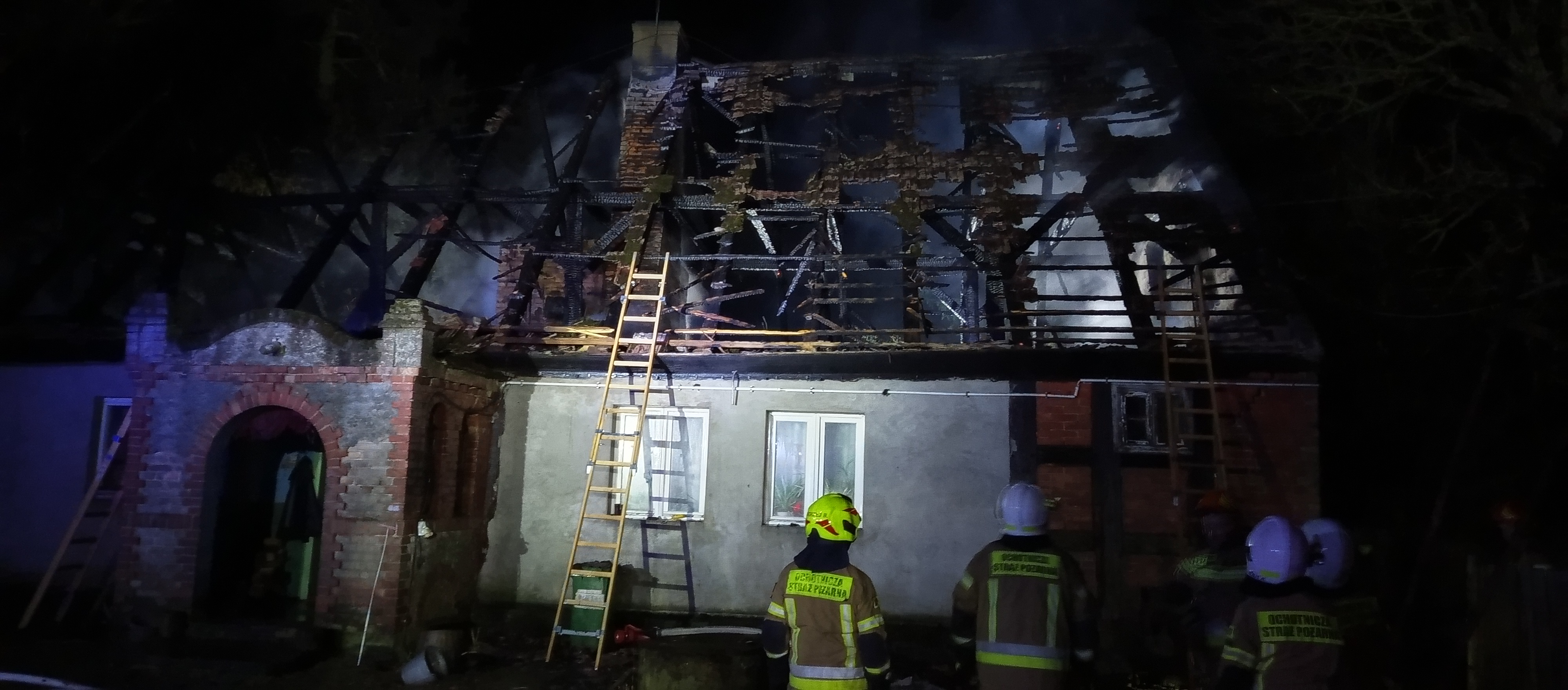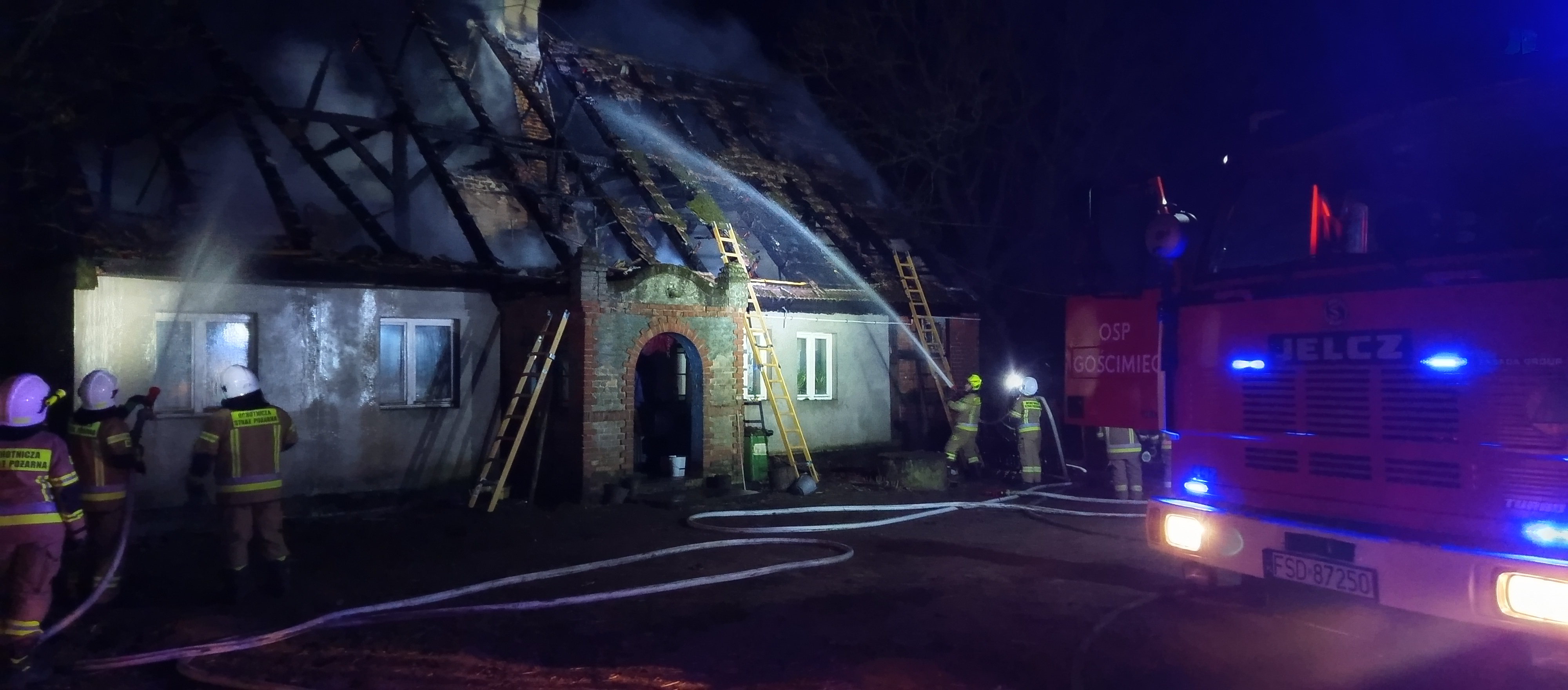 Godzina 21:13 – wpływa zgłoszenie o pożarze budynku mieszkalnego jednorodzinnego w miejscowości Gościmiec. Na miejsce natychmiast dysponowanych jest 6 zastępów strażaków, w tym podnośnik hydrauliczny, a także oficer operacyjny. Po dotarciu pierwszego zastępu strażacy zastają drewniany dach budynku mieszkalnego całkowicie zajęty ogniem, zagrożone są pomieszczenia w przyziemiu budynku, sąsiednie budynki inwentarskie i gospodarcze. Z uwagi na powagę zdarzenia, na miejsce udaje się także Zastępca Komendanta Powiatowego PSP w Strzelcach Krajeńskich. Na skutek działań gaśniczych pożar został opanowany, nie doszło do rozprzestrzenienia się ognia na sąsiednie obiekty. Dach budynku uległ całkowitemu spaleniu. Na miejsce przybył Wójt Gminy Zwierzyn – Pan Karol Neumann, który potwierdził zapewnienie tymczasowego lokalu dla dwóch mężczyzn zamieszkujących dom objęty pożarem. Działania gaśnicze, dogaszanie i zabezpieczanie obiektu trwały do północy.