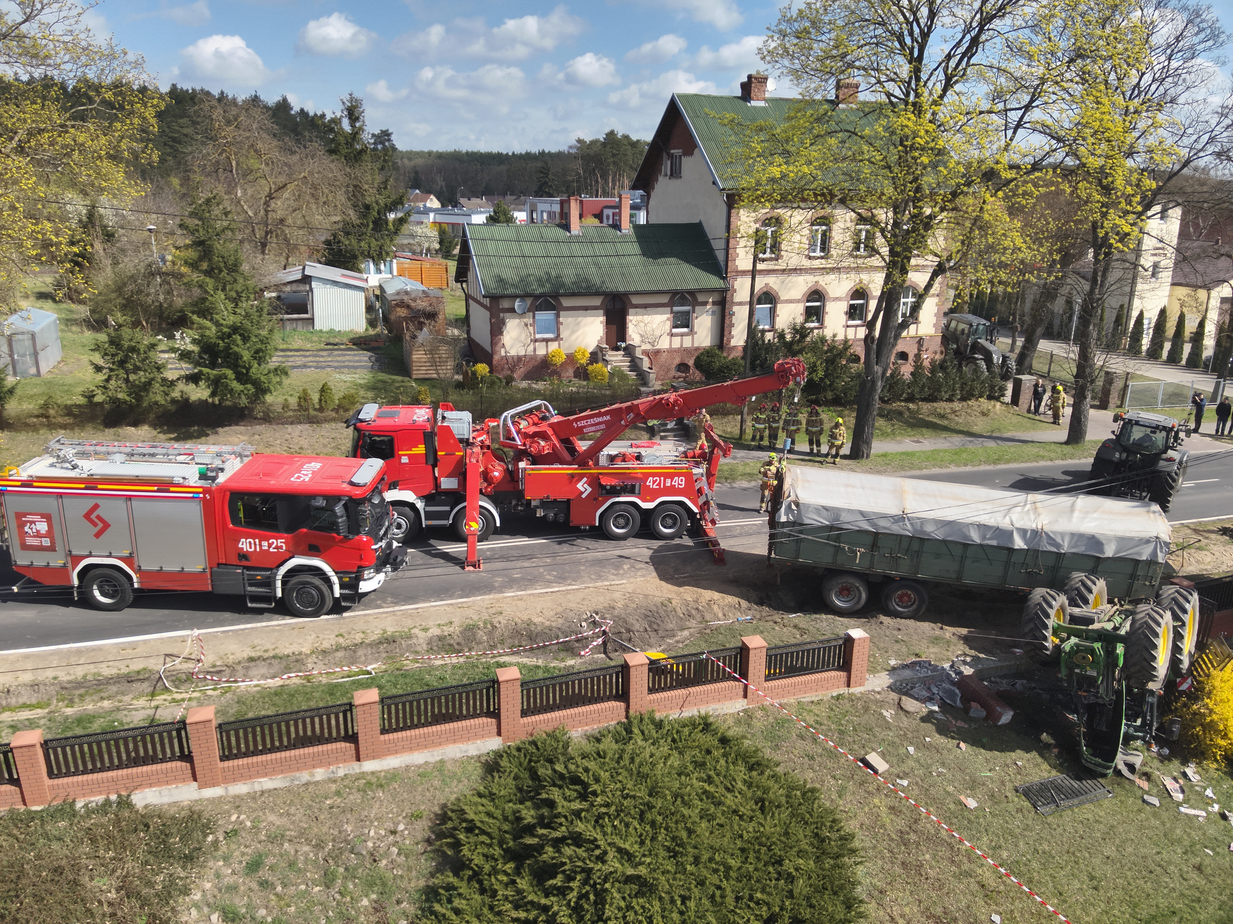 W dniu 15.04.2026 r., wczesnym rankiem, w miejscowości Zwierzyn doszło do zdarzenia drogowego z udziałem ciągnika rolniczego, który przewrócił się wraz z przyczepą załadowaną zbożem. Pojazd zatrzymał się na skarpie, stwarzając realne zagrożenie osunięcia się w kierunku pobliskiego budynku mieszkalnego.