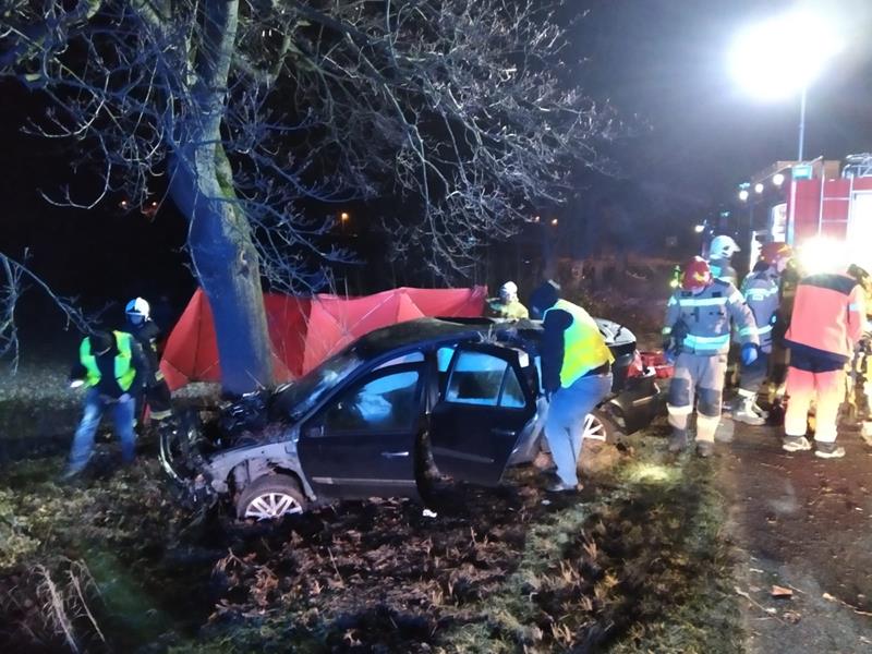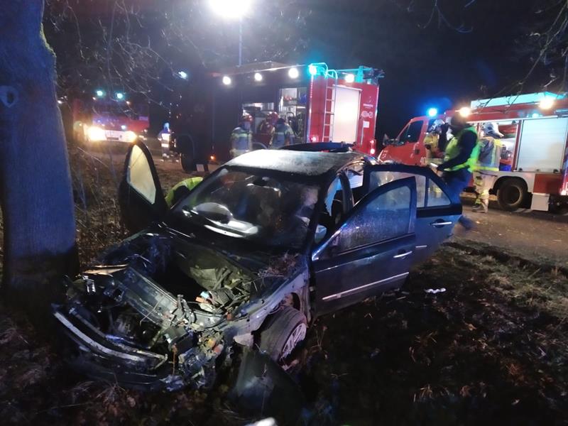 Pierwsze na miejsce (po 6 minutach od przyjęcia zgłoszenia) dotarły zastępy z JRG PSP w Strzelcach Krajeńskich Po dojeździe okazało się, że samochód osobowy marki renault megane, którym podróżowało dwóch mężczyzn wypadł z drogi, uderzył w przydrożne drzewo, następnie dachował i uderzył w drugie drzewo na poboczu. Strażacy po dojeździe na miejsce zdarzenia zabezpieczyli teren działań, miejsce zostało oświetlone, droga zamknięta. Następnie udzielono Kwalifikowanej Pierwszej Pomocy poszkodowanemu, drugi z mężczyzn został zatrzymany przez Policję.