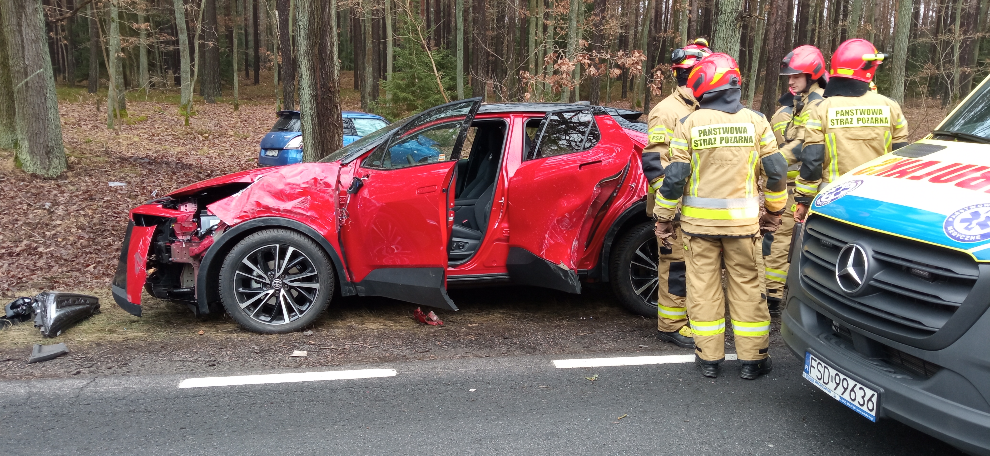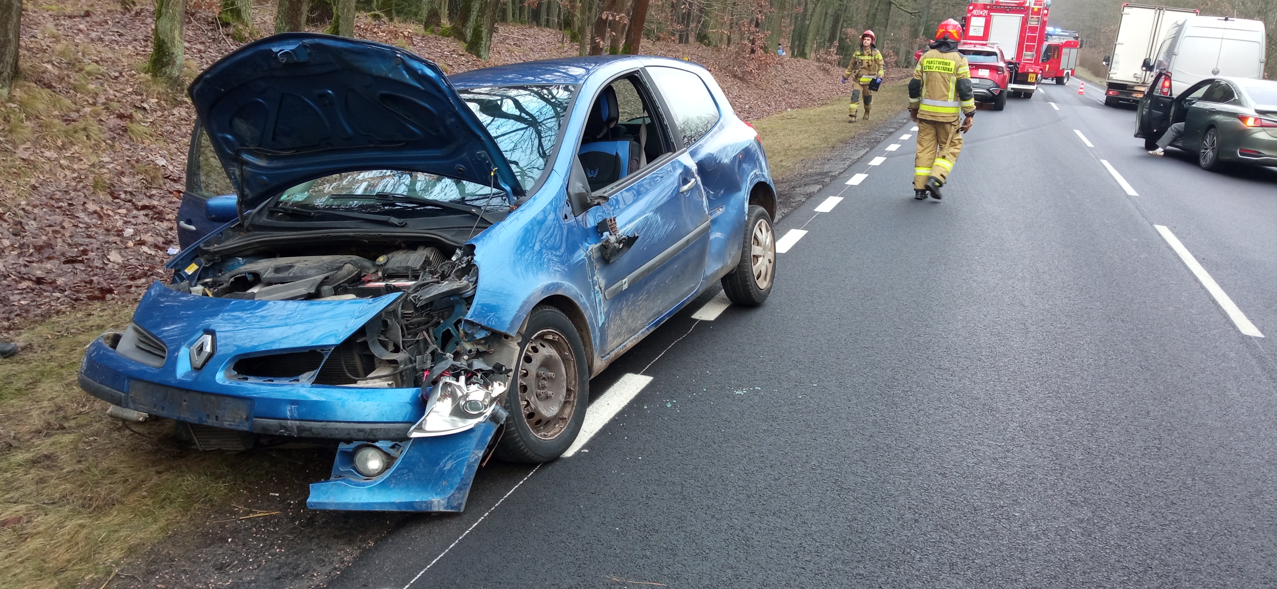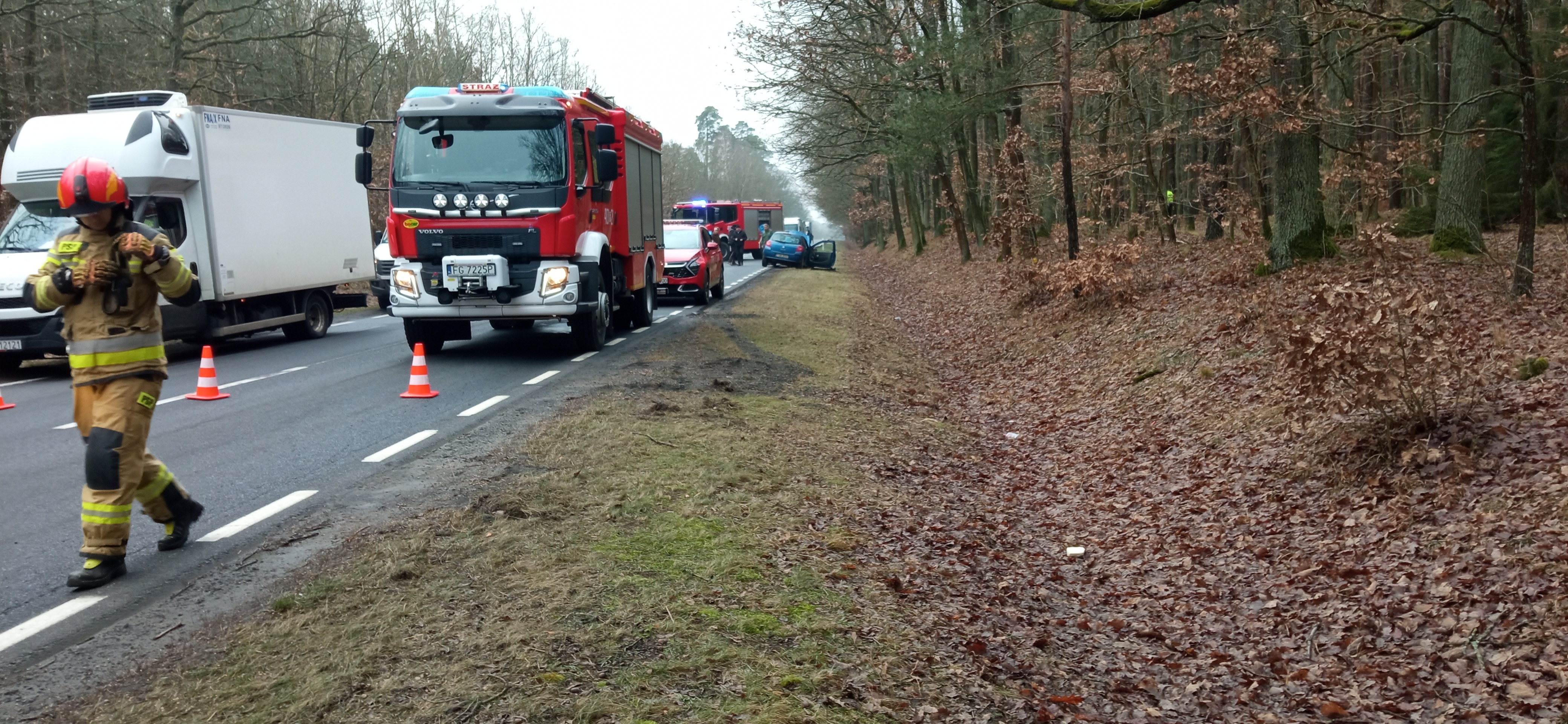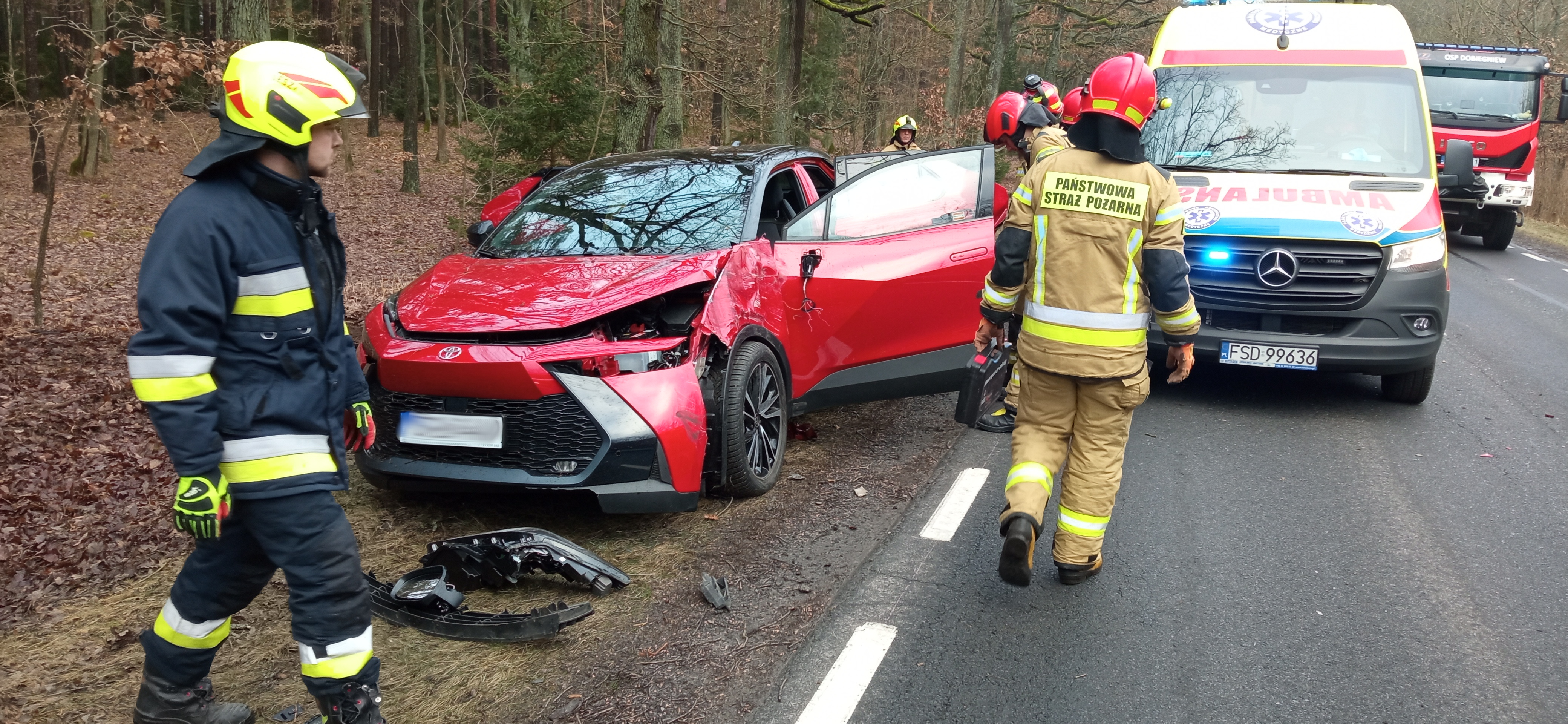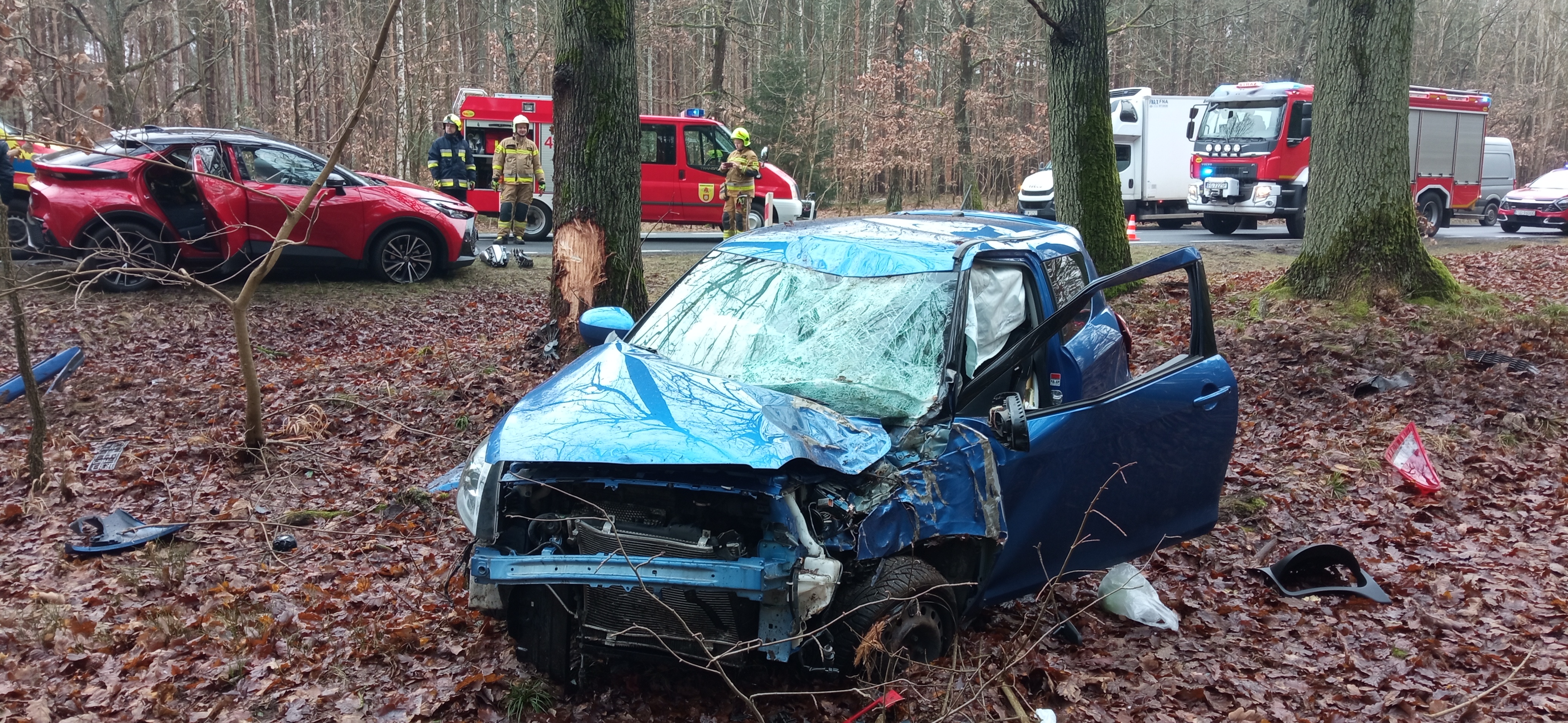 W piątek na drodze krajowej nr 22, w rejonie 98 kilometra w kierunku miejscowości Długie, doszło do poważnego wypadku z udziałem trzech samochodów osobowych. Strażacy dotarli na miejsce zdarzenia w ciągu około 10 minut od zgłoszenia i natychmiast przystąpili do działań ratowniczych. Po przeprowadzonym rozpoznaniu Kierujący Działaniem Ratowniczym stwierdził, że doszło do wypadku, w wyniku którego dwa pojazdy – Renault Clio oraz Toyota C-HR – zatrzymały się na poboczu drogi, natomiast samochód marki Suzuki Swift, w wyniku zdarzenia, zjechał z jezdni do lasu i uderzył w drzewo. Na miejscu zdarzenia obecny był już Zespół Ratownictwa Medycznego, który udzielał pomocy poszkodowanym. Wszystkie osoby podróżujące pojazdami opuściły je o własnych siłach przed przybyciem służb ratunkowych. Kierowcy Renault i Toyoty nie zgłaszali poważnych dolegliwości. Natomiast dwoje pasażerów Suzuki, którzy ucierpieli w wypadku, zostali przewiezieni przez ZRM do Szpitala Powiatowego w Drezdenku. Strażacy zabezpieczyli miejsce zdarzenia, rozmieszczając pojazdy ratownicze i pachołki ostrzegawcze. W ramach działań odłączono akumulatory w pojazdach i sprawdzono je pod kątem zagrożenia pożarowego. Z uwagi na bezpieczeństwo i konieczność usunięcia uszkodzonego pojazdu z lasu, droga krajowa DK 22 była czasowo nieprzejezdna w obu kierunkach. Po odjeździe karetki wprowadzono ruch wahadłowy, a na zakończenie działań przywrócono pełną przejezdność trasy. Akcja przebiegła sprawnie i zgodnie z procedurami. Dzięki szybkiej reakcji i współpracy z ratownikami medycznymi oraz policją, udało się ograniczyć skutki wypadku i zapewnić bezpieczeństwo wszystkim uczestnikom zdarzenia.