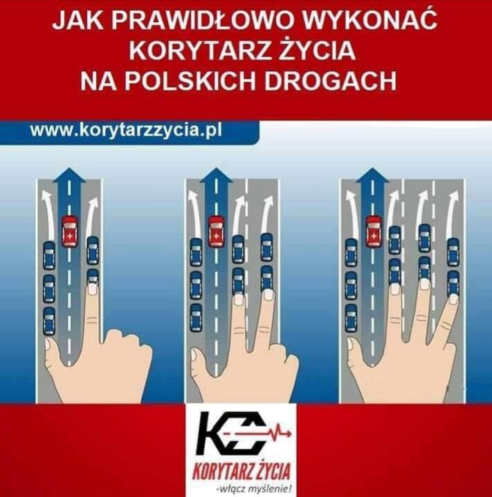 Apelujemy również do kierowców, aby w sytuacji jazdy i postoju w korku utworzyli korytarz życia, którym służby ratownicze sprawnie dotrą do miejsca zdarzenia, gdzie potrzebna jest natychmiastowa pomoc.
