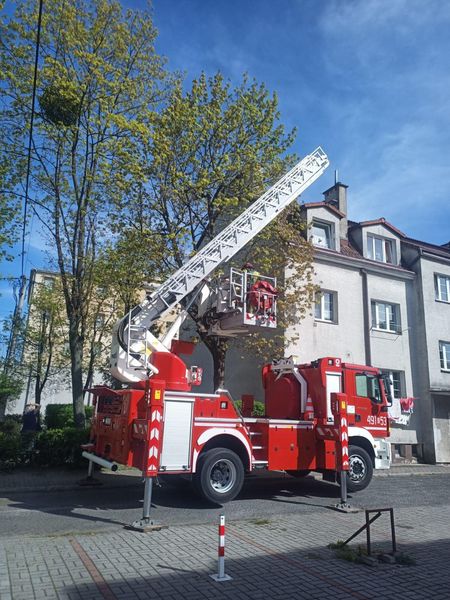 Nasi strażacy przy pomocy podnośnika zdjęli małpkę i przekazali całą i zdrową właścicielce.