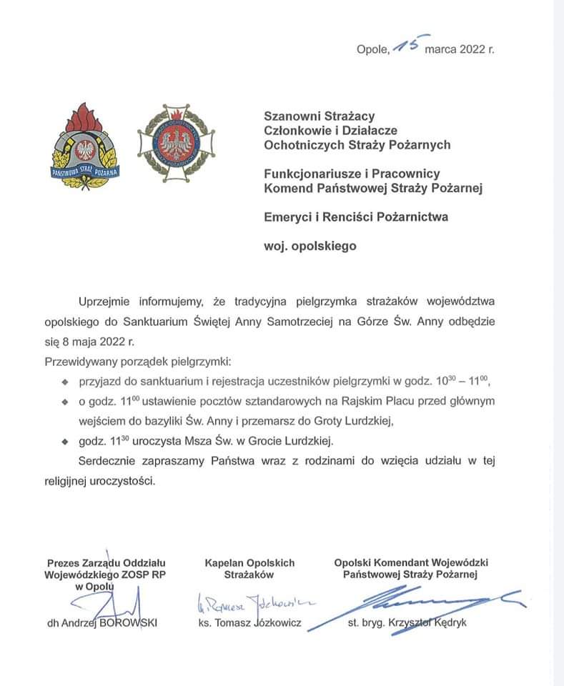 Pielgrzymka strażaków województwa opolskiego do Sanktuarium Świętej Anny Samotrzeciej na Górę Św. Anny odbędzie się 8 maja 2022, poniżej pełna informacja.