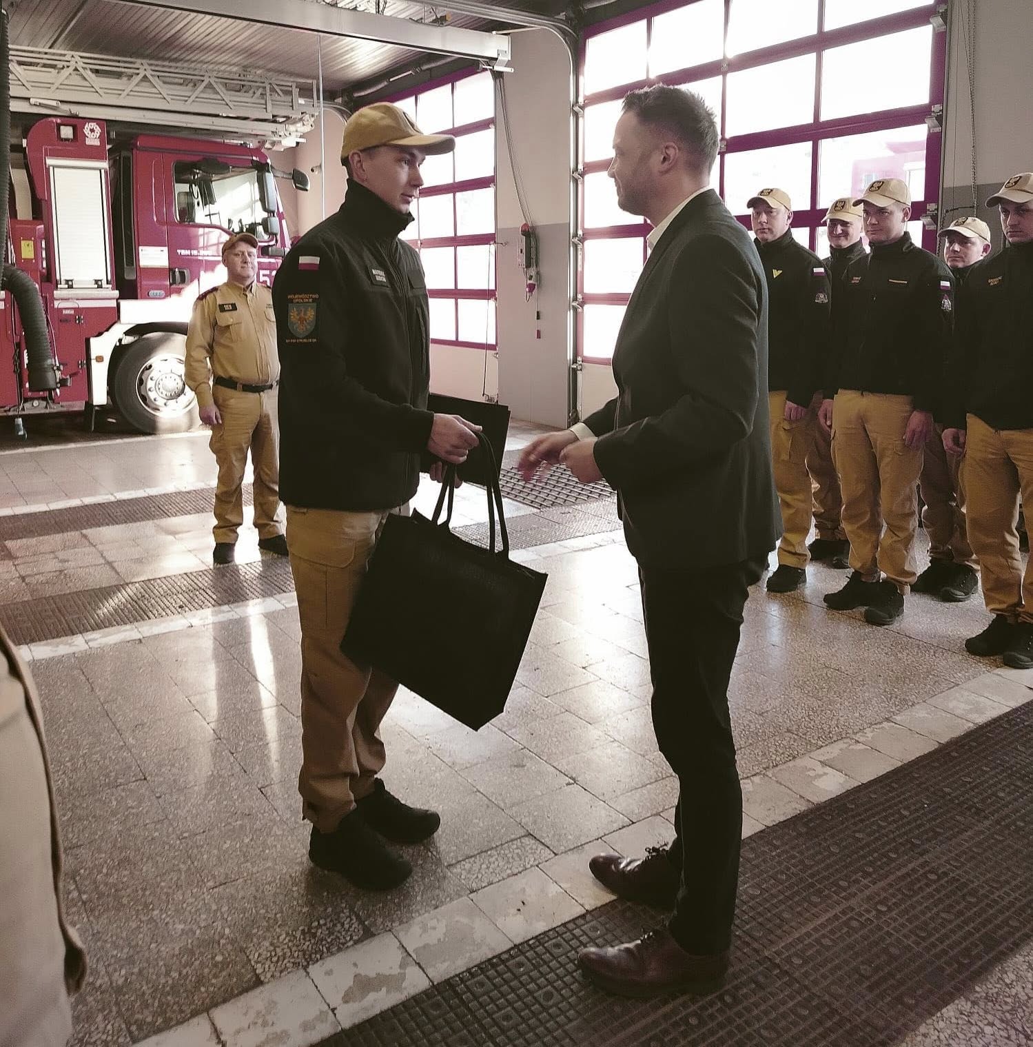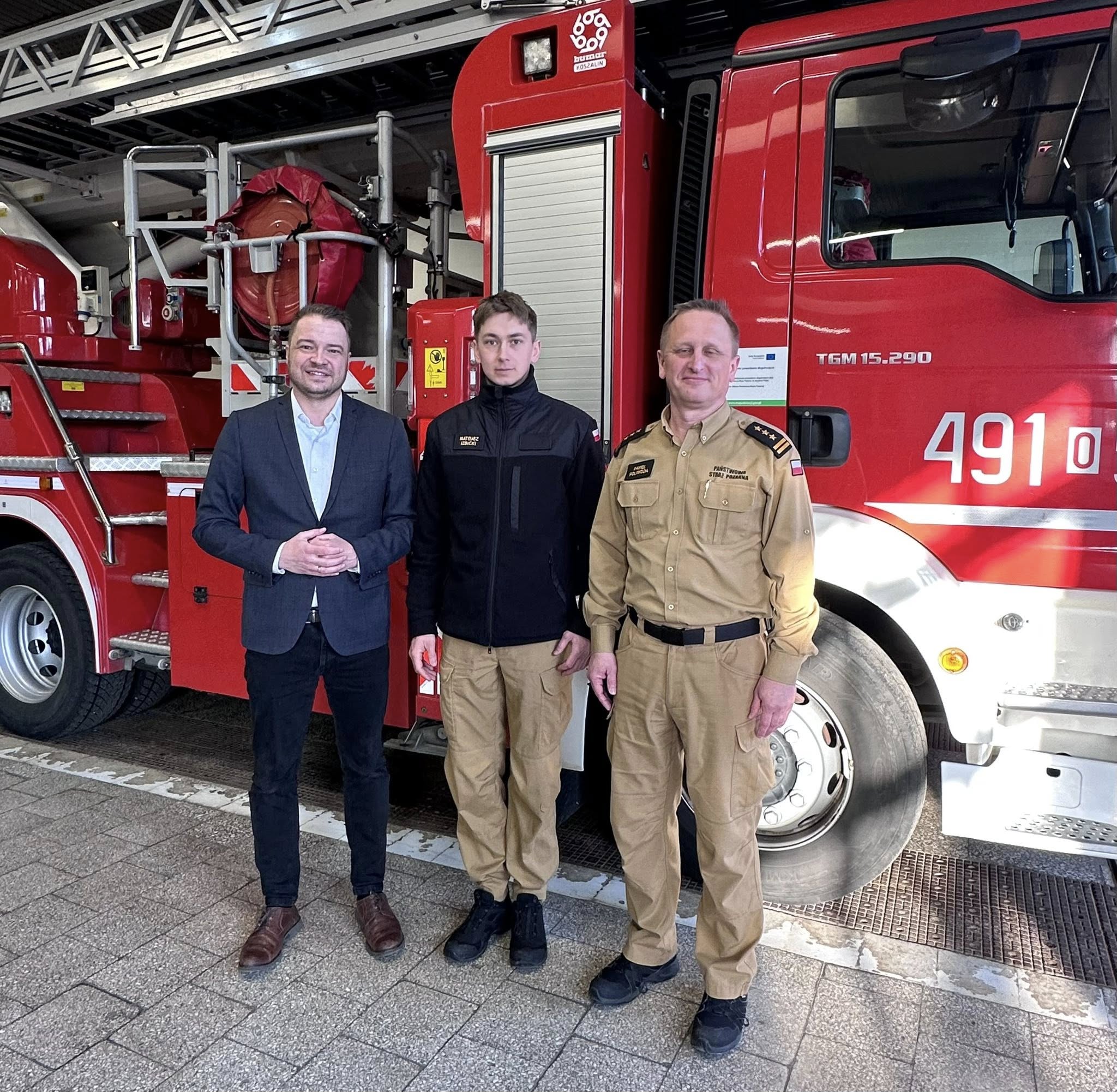 Słowa uznania i gratulacje strażakowi złożył również Burmistrz Ujazdu Hubert Ibrom, podkreślając, że postawa Mateusza Izbickiego jest wzorem do naśladowania i dowodem na to, jak ogromne znaczenie ma gotowość do niesienia pomocy drugiemu człowiekowi – niezależnie od miejsca i czasu. Burmistrz zaznaczył, że takie zachowanie buduje poczucie bezpieczeństwa wśród mieszkańców oraz pokazuje, jak ważną rolę w lokalnej społeczności odgrywają strażacy. Wyraził również wdzięczność za zaangażowanie, profesjonalizm oraz poświęcenie, które na co dzień towarzyszą służbie.