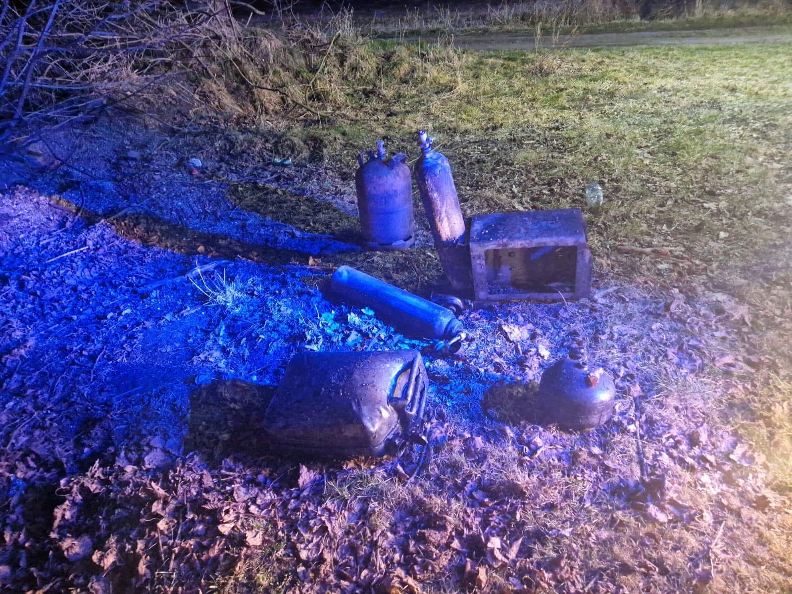 - wyniesieniu z garaży trzech butli 11kg propan-butan oraz dwóch butli 6 kg z dwutlenkiem węgla na zewnątrz oraz ich schładzaniu,