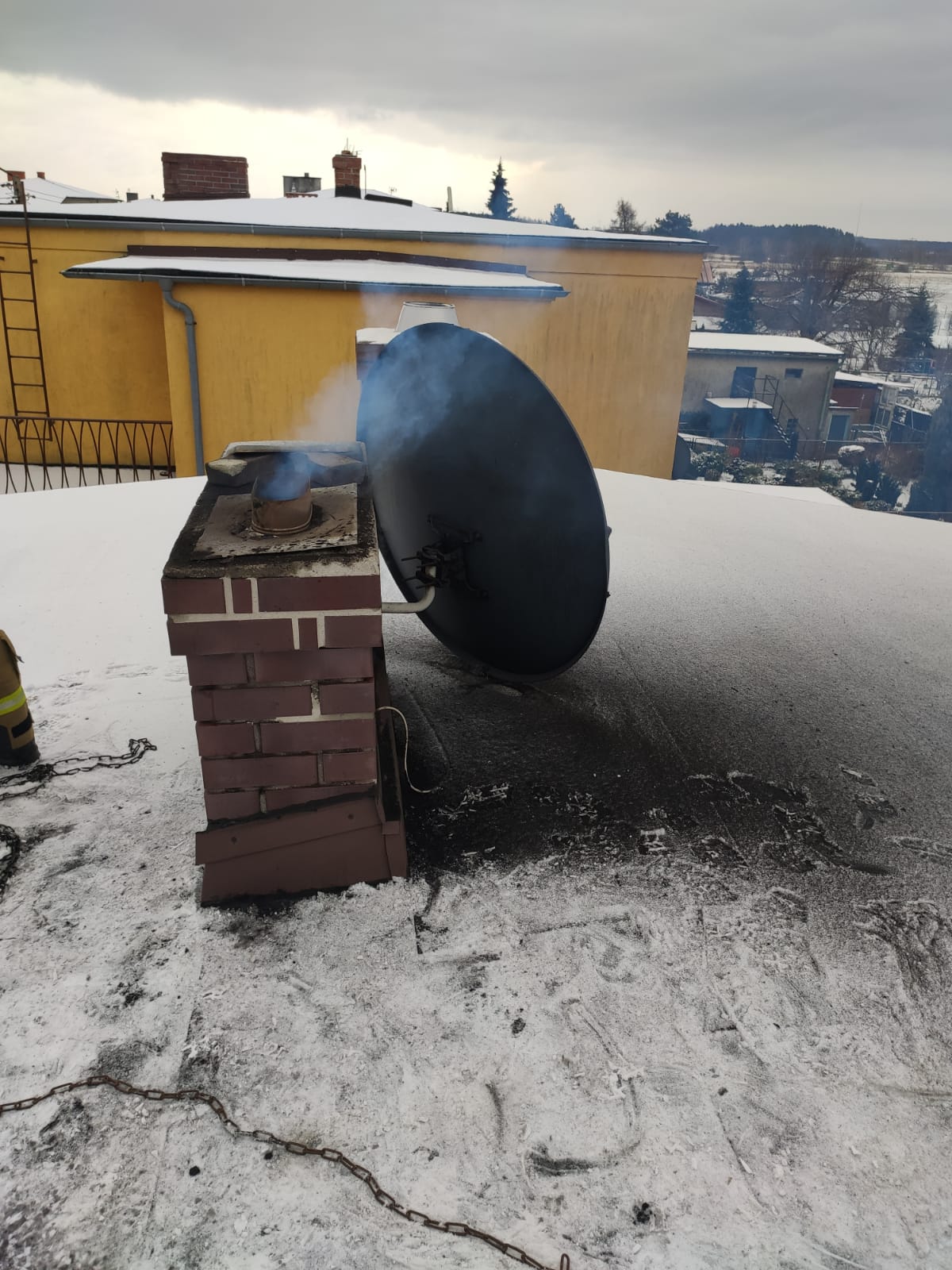 Działania polegały na: wygaszeniu pieca, usunięciu materiału palonego z pieca, założeniu sita kominowego, usunięciu palącej się sadzy z przewodu dymowego oraz sprawdzeniu wszystkich pomieszczeń miernikiem wielogazowym.